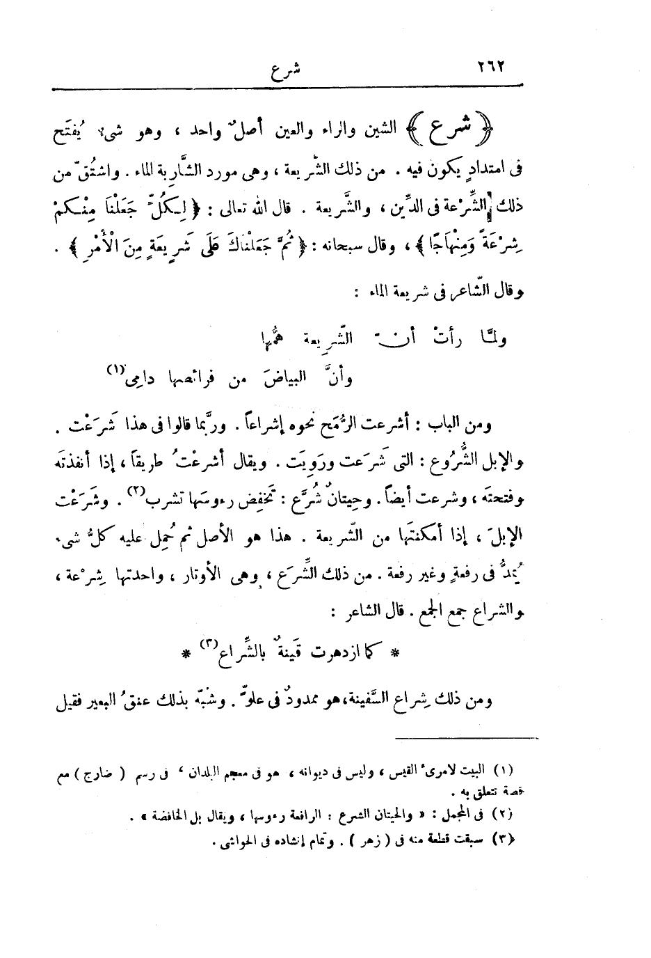 (شَرَعَ) الشِّينُ وَالرَّاءُ وَالْعَيْنُ أَصْلٌ وَاحِدٌ، وَهُوَ شَيْءٌ يُفْتَحُ فِي امْتِدَادٍ يَكُونُ فِيهِ. مِنْ ذَلِكَ الشَّرِيعَةُ، وَهِيَ مَوْرِدُ الشَّارِبَةِ الْمَاءَ. وَاشْتُقَّ مِنْ ذَلِكَ الشِّرْعَةُ فِي الدِّينِ وَالشَّرِيعَةِ. قَالَ اللَّهُ تَعَالَى: {لِكُلٍّ جَعَلْنَا مِنْكُمْ شِرْعَةً وَمِنْهَاجًا} [المائدة: 48] ، وَقَالَ سُبْحَانَهُ: {ثُمَّ جَعَلْنَاكَ عَلَى شَرِيعَةٍ مِنَ الْأَمْرِ} [الجاثية: 18] . وَقَالَ الشَّاعِرُ فِي شَرِيعَةِ الْمَاءِ: