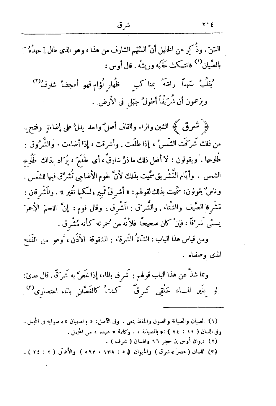 (شَرَقَ) الشِّينُ وَالرَّاءُ وَالْقَافُ أَصْلٌ وَاحِدٌ يَدُلُّ عَلَى إِضَاءَةٍ وَفَتْحٍ. مِنْ ذَلِكَ شَرَقَتِ الشَّمْسُ، إِذَا طَلَعَتْ. وَأَشْرَقَتْ، إِذَا أَضَاءَتْ. وَالشُّرُوقُ: طُلُوعُهَا. وَيَقُولُونَ: لَا أَفْعَلُ ذَلِكَ مَا ذَرَّ شَارِقٌ، أَيْ طَلَعَ، يُرَادُ بِذَلِكَ طُلُوعُ الشَّمْسِ. وَأَيَّامُ التَّشْرِيقِ سُمِّيَتْ بِذَلِكَ لِأَنَّ لُحُومَ الْأَضَاحِيِّ تُشَرَّقُ فِيهَا لِلشَّمْسِ. وَنَاسٌ يَقُولُونَ: سُمِّيَتْ بِذَلِكَ لِقَوْلِهِمْ: " أَشْرِقْ ثَبِيرُ، لِكَيْمَا نُغِيرُ ". وَالْمَشْرِقَانِ: مَشْرِقَا الصَّيْفِ وَالشِّتَاءِ. وَالشَّرْقُ: الْمَشْرِقُ. وَقَالَ قَوْمٌ: إِنَّ اللَّحْمَ الْأَحْمَرَ يُسَمَّى شَرْقًا. فَإِنْ كَانَ صَحِيحًا فَلِأَنَّهُ مِنْ حُمْرَتِهِ كَأَنَّهُ مُشْرِقٌ.