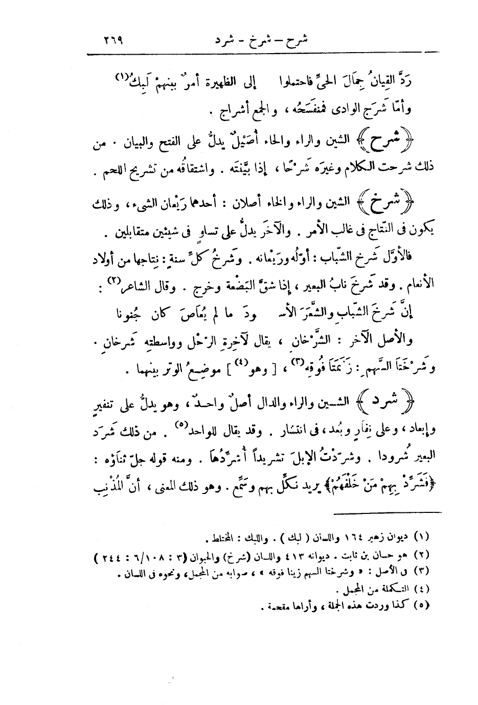 (شَرَدَ) الشِّينُ وَالرَّاءُ وَالدَّالُ أَصْلٌ وَاحِدٌ، وَهُوَ يَدُلُّ عَلَى تَنْفِيرٍ وَإِبْعَادٍ، وَعَلَى نِفَارٍ وَبُعْدٍ فِي انْتِشَارٍ. وَقَدْ يُقَالُ لِلْوَاحِدِ مِنْ ذَلِكَ شَرَدَ الْبَعِيرُ شُرُودًا. وَشَرَّدْتُ الْإِبِلَ تَشْرِيدًا أُشَرِّدُهَا. وَمِنْهُ قَوْلُهُ جَلَّ ثَنَاؤُهُ: {فَشَرِّدْ بِهِمْ مَنْ خَلْفَهُمْ} [الأنفال: 57] ، يُرِيدُ نَكِّلْ بِهِمْ وَسَمِّعْ. وَهُوَ ذَلِكَ الْمَعْنَى، أَنَّ الْمُذْنِبَ