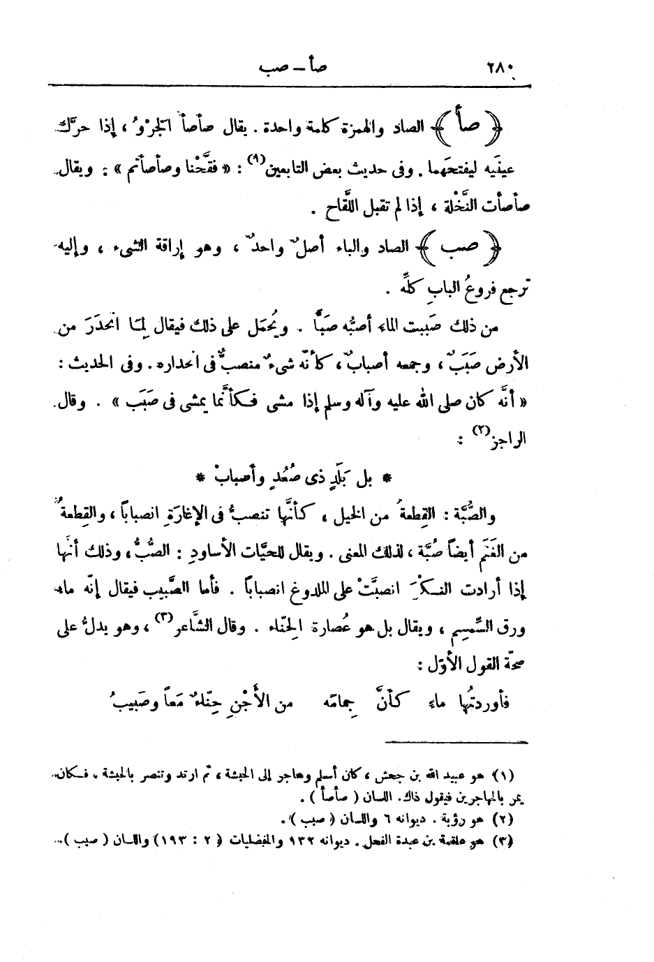 وَالصُّبَّةُ: الْقِطْعَةُ مِنَ الْخَيْلِ، كَأَنَّهَا تَنْصَبُّ فِي الْإِغَارَةِ انْصِبَابًا، وَالْقِطْعَةُ مِنَ الْغَنَمِ أَيْضًا صَبَّةٌ، لِذَلِكَ الْمَعْنَى. وَيُقَالُ لِلْحَيَّاتِ الْأَسَاوِدِ: الصَّبُّ ; وَذَلِكَ أَنَّهَا إِذَا أَرَادَتِ النَّكْزَ انْصَبَّتْ عَلَى الْمَلْدُوغِ انْصِبَابًا. فَأَمَّا الصَّبِيبُ فَيُقَالُ إِنَّهُ مَاءُ وَرَقِ السِّمْسِمِ، وَيُقَالُ بَلْ هُوَ عُصَارَةُ الْحِنَّاءِ. وَقَالَ الشَّاعِرُ، وَهُوَ يَدُلُّ عَلَى صِحَّةِ الْقَوْلِ الْأَوَّلِ: