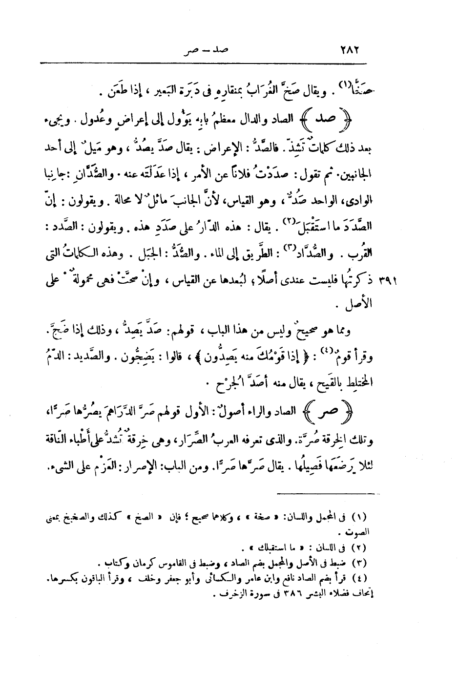 وَمِمَّا هُوَ صَحِيحٌ وَلَيْسَ مِنْ هَذَا الْبَابِ، قَوْلُهُمْ: صَدَّ يَصِدُّ، وَذَلِكَ إِذَا ضَجَّ. وَقَرَأَ قَوْمٌ: {إِذَا قَوْمُكَ مِنْهُ يَصِدُّونَ} [الزخرف: 57] ، قَالُوا: يَضِجُّونَ. وَالصَّدِيدُ: الدَّمُ الْمُخْتَلِطُ بِالْقَيْحِ، يُقَالُ مِنْهُ: أَصَدَّ الْجُرْحُ.
