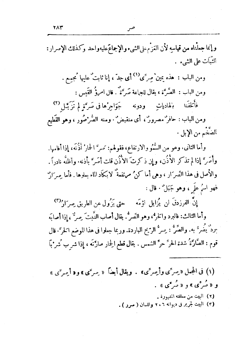 وَأَمَّا الثَّالِثُ: فَالْبَرْدُ وَالْحَرُّ، وَهُوَ الصِّرُّ. يُقَالُ أَصَابَ النَّبْتَ صِرٌّ، إِذَا أَصَابَهُ بَرْدٌ يُضِرُّ بِهِ. وَالصِّرُّ: صِرُّ الرِّيحِ الْبَارِدَةِ. وَرُبَّمَا جَعَلُوا فِي هَذَا الْمَوْضِعِ الْحَرَّ. قَالَ قَوْمٌ: الصَّارَّةُ: شِدَّةُ الْحَرِّ حَرِّ الشَّمْسِ. يُقَالُ: قَطَعَ الْحِمَارُ صَارَّتَهُ. إِذَا شَرِبَ شُرْبًا
