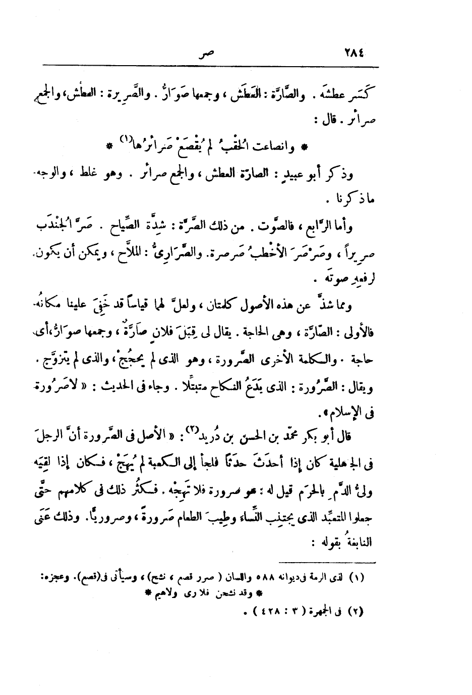 وَمِمَّا شَذَّ عَنْ هَذِهِ الْأُصُولِ كَلِمَتَانِ، وَلَعَلَّ لَهُمَا قِيَاسًا قَدْ خَفِيَ عَلَيْنَا مَكَانُهُ، فَالْأُولَى: الصَّارَّةُ، وَهِيَ الْحَاجَةُ. يُقَالُ: لِي قِبَلَ فُلَانٍ صَارَّةٌ، وَجَمْعُهَا صَوَارُّ، أَيْ حَاجَةٌ. وَالْكَلِمَةُ الْأُخْرَى الصَّرُورَةُ، وَهُوَ الَّذِي لَمْ يَحْجُجْ، وَالَّذِي لَمْ يَتَزَوَّجْ. وَيُقَالُ الصَّرُورَةُ: الَّذِي يَدَعُ النِّكَاحَ مُتَبَتِّلًا. وَجَاءَ فِي الْحَدِيثِ: «لَا صَرُورَةَ فِي الْإِسْلَامِ» .