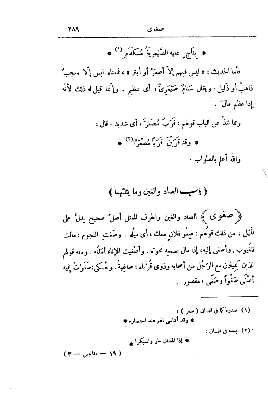 فَأَمَّا الْحَدِيثُ: «لَيْسَ فِيهِمْ إِلَّا أَصْعَرُ أَوْ أَبْتَرُ» ، فَمَعْنَاهُ لَيْسَ إِلَّا مُعْجَبٌ ذَاهِبٌ أَوْ ذَلِيلٌ. وَيُقَالُ: سَنَامٌ صَيْعَرِيٌّ، أَيْ عَظِيمٌ. وَإِنَّمَا قِيلَ لَهُ ذَلِكَ لِأَنَّهُ إِذَا عَظُمَ مَالَ. وَمِمَّا شَذَّ عَنِ الْبَابِ قَوْلُهُمْ: قَرَبٌ مُصْعَرٌّ، أَيْ شَدِيدٌ. قَالَ:
