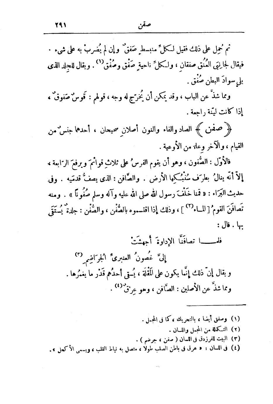 فَالْأَوَّلُ: الصُّفُونُ، وَهُوَ أَنْ يَقُومَ الْفَرَسُ عَلَى ثَلَاثِ قَوَائِمَ وَيَرْفَعَ الرَّابِعَةَ، إِلَّا أَنَّهُ يَنَالُ بِطَرَفِ سُنْبُكِهَا الْأَرْضَ. وَالصَّافِنُ: الَّذِي يَصُفُّ قَدَمَيْهِ. وَفِي حَدِيثِ الْبَرَاءِ: «قُمْنَا خَلْفَ رَسُولِ اللَّهِ - صَلَّى اللَّهُ عَلَيْهِ وَآلِهِ وَسَلَّمَ - صُفُونًا» . وَمِنْهُ تَصَافَنَ الْقَوْمُ [الْمَاءَ] ، وَذَلِكَ إِذَا اقْتَسَمُوهُ بِالصُّفْنِ، وَالصُّفْنُ: جِلْدَةٌ يُسْتَقَى بِهَا. قَالَ:
