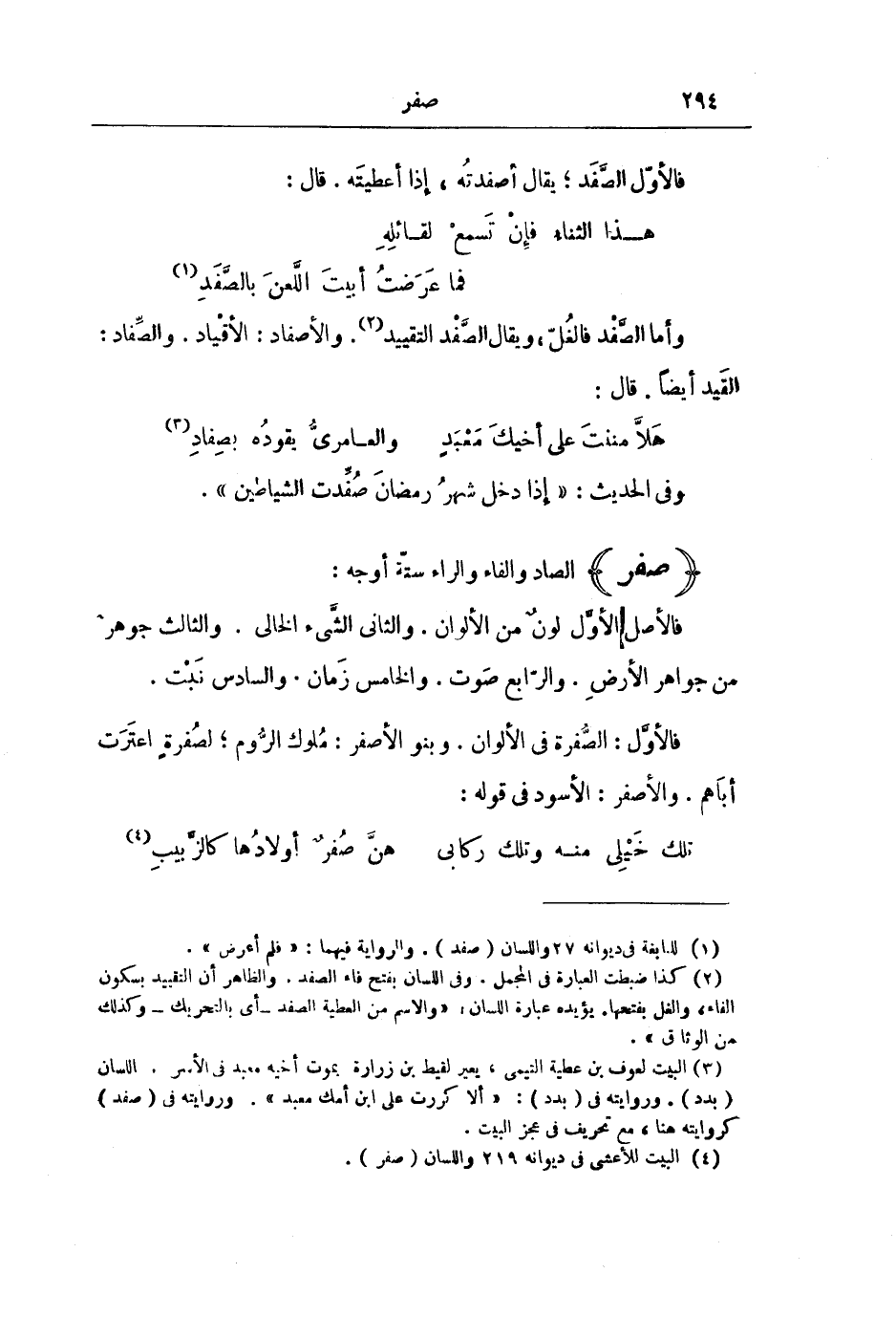 فَالْأَوَّلُ: الصُّفْرَةُ فِي الْأَلْوَانِ، وَبَنُو الْأَصْفَرِ: مُلُوكُ الرُّومِ؛ لِصُفْرَةٍ اعْتَرَتْ أَبَاهُمْ. وَالْأَصْفَرُ: الْأَسْوَدُ، فِي قَوْلِهِ: