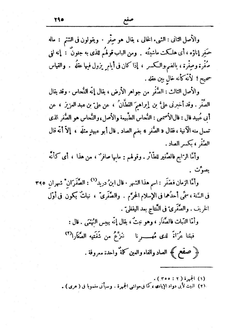 وَأَمَّا الزَّمَانُ فَصَفَرٌ: اسْمُ هَذَا الشَّهْرِ. قَالَ ابْنُ دُرَيْدٍ: الصَّفَرَانِ شَهْرَانِ فِي السَّنَةِ، سُمِّيَ أَحَدُهُمَا فِي الْإِسْلَامِ الْمُحَرَّمَ. وَالصَّفَرِيُّ، نَبَاتٌ يَكُونُ فِي أَوَّلِ الْخَرِيفِ. وَالصَّفَرِيُّ فِي النَّتَاجِ بَعْدَ الْيَقَظِيِّ.
