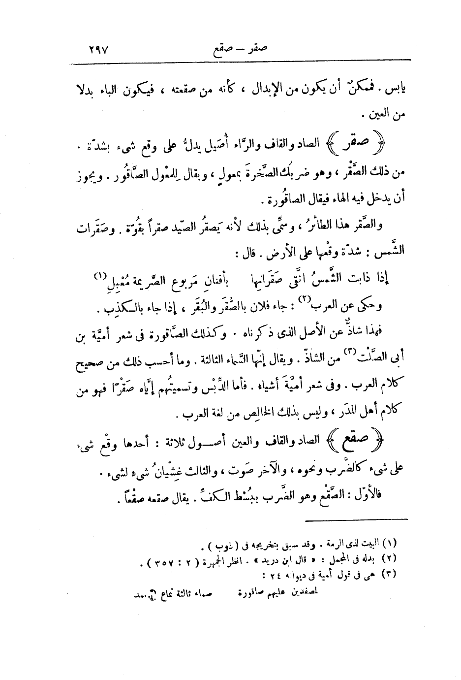 فَهَذَا شَاذٌّ عَنِ الْأَصْلِ الَّذِي ذَكَرْنَاهُ. وَكَذَلِكَ الصَّاقُورَةُ فِي شِعْرِ أُمَيَّةَ بْنِ أَبِي الصَّلْتِ مِنَ الشَّاذِّ. وَيُقَالُ: إِنَّهَا السَّمَاءُ الثَّالِثَةُ. وَمَا أَحْسَبُ ذَلِكَ مِنْ صَحِيحِ كَلَامِ الْعَرَبِ. وَفِي شِعْرِ أُمَيَّةَ أَشْيَاءُ. فَأَمَّا الدِّبْسُ وَتَسْمِيَتُهُمْ إِيَّاهُ صَقْرًا فَهُوَ مِنْ كَلَامِ أَهْلِ الْمَدَرِ، وَلَيْسَ بِذَلِكَ الْخَالِصِ مِنْ لُغَةِ الْعَرَبِ.