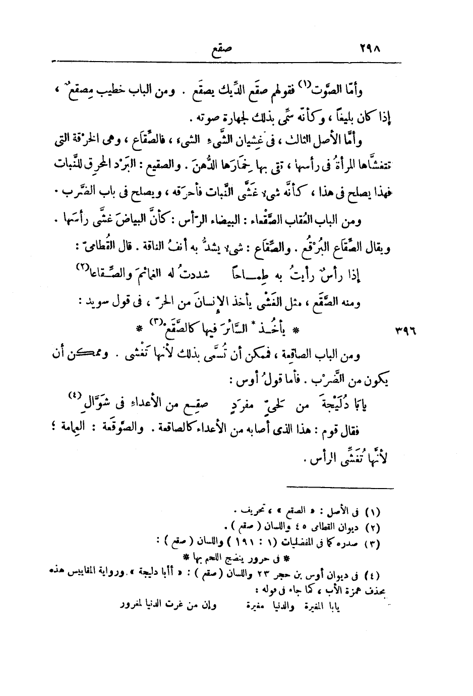 وَمِنَ الْبَابِ الصَّاقِعَةُ، فَمُمْكِنٌ أَنْ تُسَمَّى بِذَلِكَ لِأَنَّهَا تَغْشَى. وَمُمْكِنٌ أَنْ يَكُونَ مِنَ الضَّرْبِ. أَمَّا قَوْلُ أَوْسٍ: