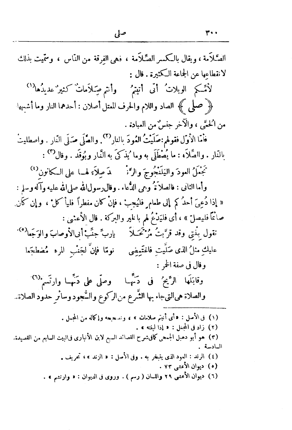 فَأَمَّا الْأَوَّلُ فَقَوْلُهُمْ: صَلَيْتُ الْعُودَ بِالنَّارِ. وَالصَّلَى صَلَى النَّارِ. وَاصْطَلَيْتُ بِالنَّارِ. وَالصِّلَاءُ: مَا يُصْطَلَى بِهِ وَمَا يُذْكَى بِهِ النَّارُ وَيُوقَدُ. وَقَالَ: