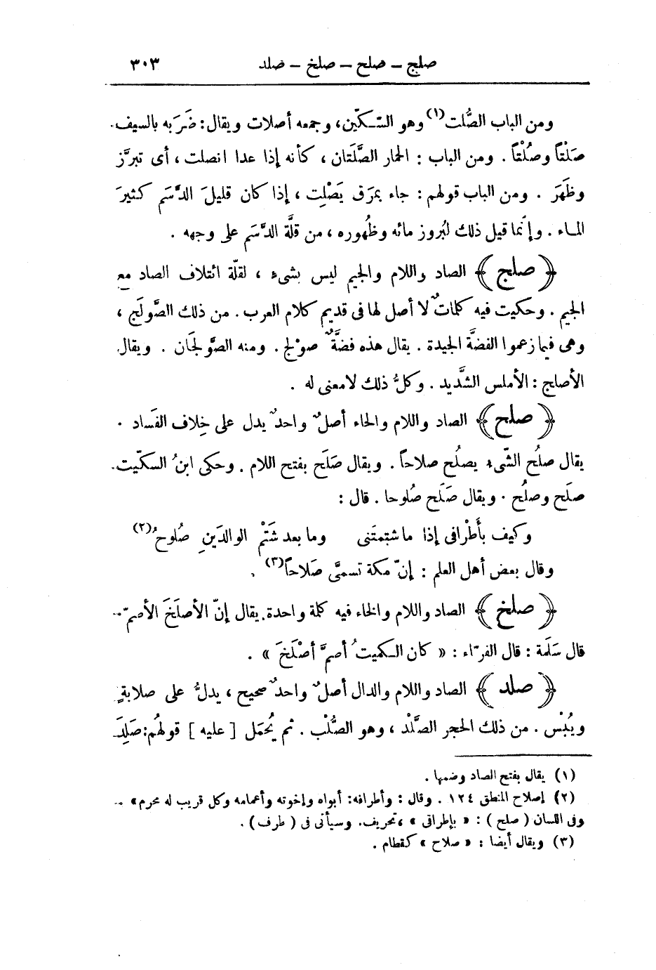 (صَلَحَ) الصَّادُ وَاللَّامُ وَالْحَاءُ أَصْلٌ وَاحِدٌ يَدُلُّ عَلَى خِلَافِ الْفَسَادِ. يُقَالُ: صَلُحَ الشَّيْءُ يَصْلُحُ صَلَاحًا. وَيُقَالُ: صَلَحَ بِفَتْحِ اللَّامِ. وَحَكَى ابْنُ السِّكِّيتِ صَلَحَ وَصَلُحَ. وَيُقَالُ: صَلَحَ صُلُوحًا، قَالَ: