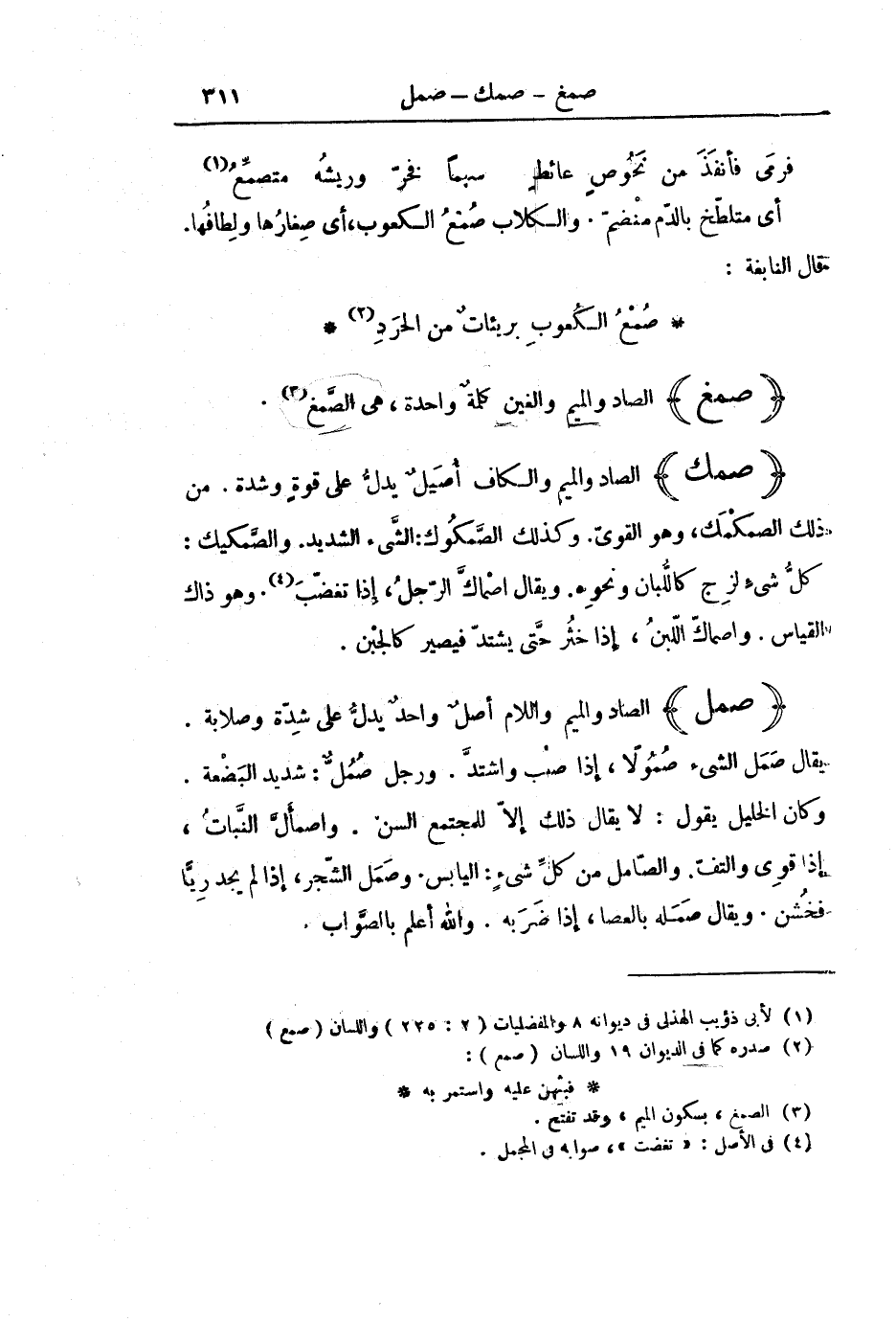 أَيْ مُتَلَطِّخٌ بِالدَّمِ مُنْضَمٌّ. وَالْكِلَابُ صُمْعُ الْكُعُوبِ، أَيْ صِغَارُهَا وَلِطَافُهَا، قَالَ النَّابِغَةُ: