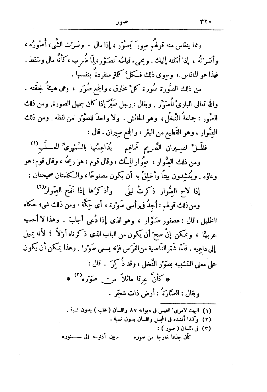 مِنْ ذَلِكَ الصُّورَةُ صُورَةُ كُلِّ مَخْلُوقٍ، وَالْجَمْعُ صُوَرٌ، وَهِيَ هَيْئَةُ خِلْقَتِهِ. وَاللَّهُ تَعَالَى الْبَارِئُ الْمُصَوِّرُ. وَيُقَالُ: رَجُلٌ صَيِّرٌ إِذَا كَانَ جَمِيلَ الصُّورَةِ. وَمِنْ ذَلِكَ الصَّوْرُ: جَمَاعَةُ النَّخْلِ، وَهُوَ الْحَائِشُ. وَلَا وَاحِدَ لِلصَّوْرِ مِنْ لَفْظِهِ. وَمِنْ ذَلِكَ الصُِّوارُ، وَهُوَ الْقَطِيعُ مِنَ الْبَقَرِ، وَالْجَمْعِ صِيرَانٌ. قَالَ: