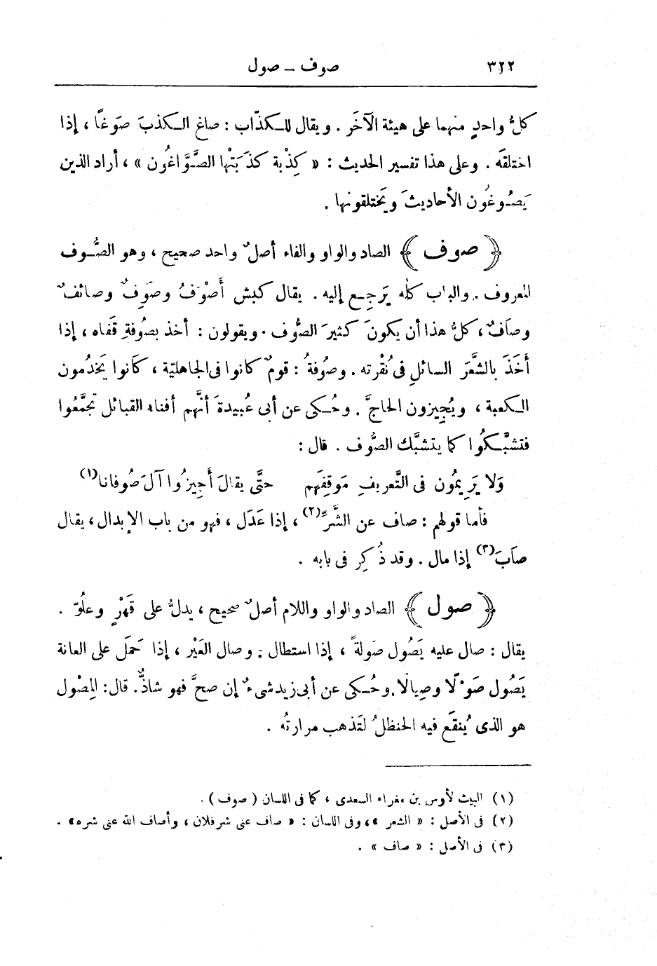 (صَوَفَ) الصَّادُ وَالْوَاوُ وَالْفَاءُ أَصْلٌ وَاحِدٌ صَحِيحٌ، وَهُوَ الصُّوفُ الْمَعْرُوفُ. وَالْبَابُ كُلُّهُ يَرْجِعُ إِلَيْهِ. يُقَالُ: كَبْشٌ أَصْوَفُ وَصَوِفٌ وَصَائِفٌ وِصَافٌ، كُلُّ هَذَا أَنْ يَكُونَ كَثِيرَ الصُّوفِ. وَيَقُولُونَ: أَخَذَ بِصُوفَةِ قَفَاهُ، إِذَا أَخَذَ بِالشَّعَرِ السَّائِلِ فِي نُقْرَتِهِ. وَصُوفَةُ: قَوْمٌ كَانُوا فِي الْجَاهِلِيَّةِ، كَانُوا يَخْدِمُونَ الْكَعْبَةَ، وَيُجِيزُونَ الْحَاجَّ. وَحُكِيَ عَنْ أَبِي عُبَيْدَةَ أَنَّهُمْ أَفْنَاءُ الْقَبَائِلِ تَجَمَّعُوا فَتَشَبَّكُوا كَمَا يَتَشَبَّكُ الصُّوفُ. قَالَ: