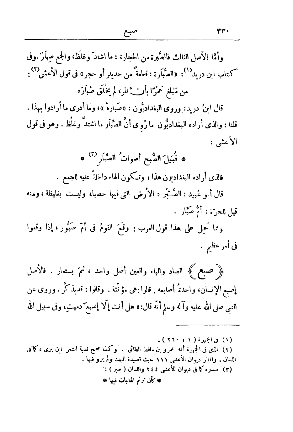 وَأَمَّا الْأَصْلُ الثَّالِثُ فَالصُّبْرَةُ مِنَ الْحِجَارَةِ: مَا اشْتَدَّ وَغَلُظَ، وَالْجَمْعُ: صِبَارٌ، وَفِي كِتَابِ ابْنِ دُرَيْدٍ: " الصُّبَارَةُ: قِطْعَةٌ مِنْ حَدِيدٍ أَوْ حَجَرٍ " فِي قَوْلِ الْأَعْشَى: