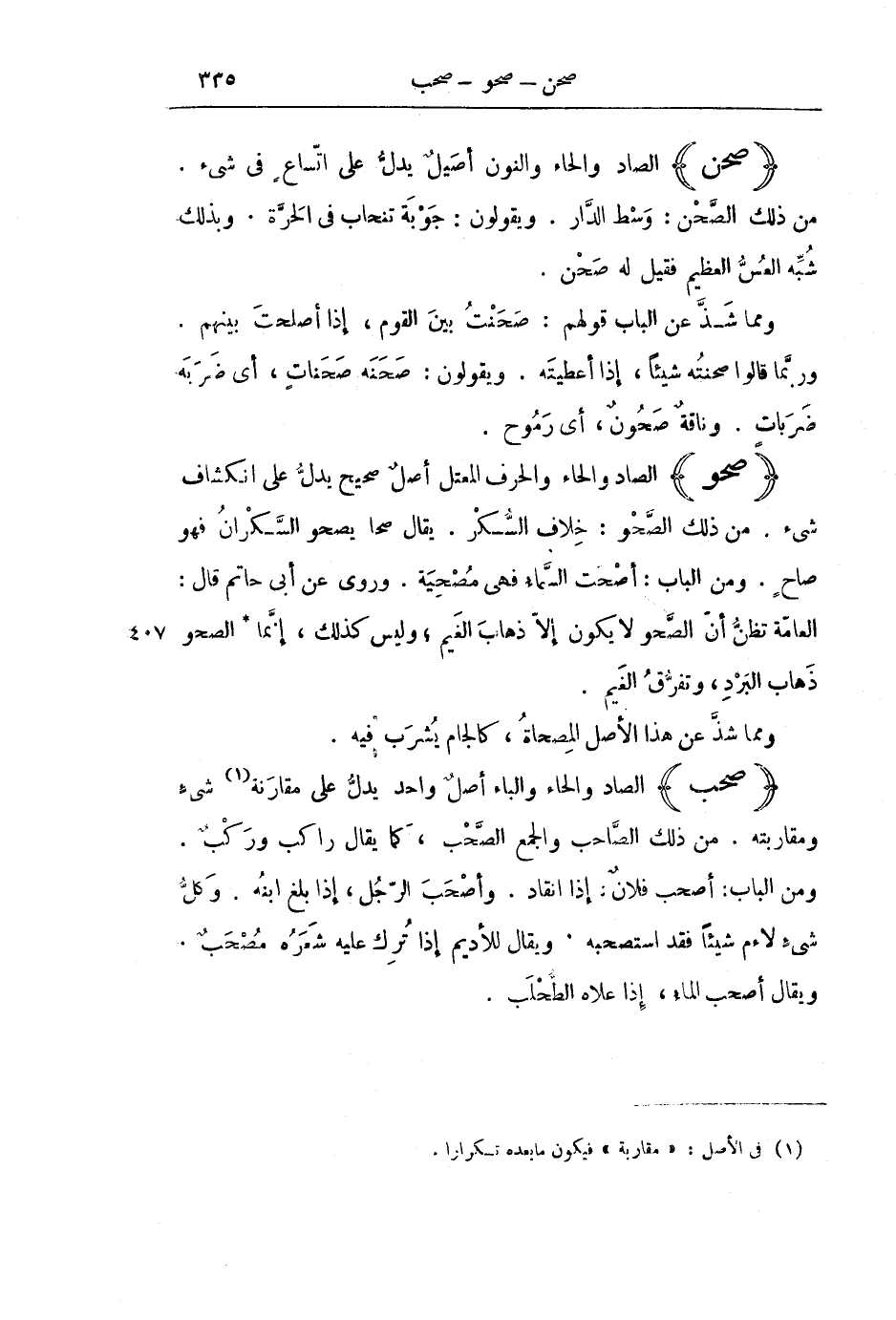 وَمِمَّا شَذَّ عَنِ الْبَابِ قَوْلُهُمْ: صَحَنْتُ بَيْنَ الْقَوْمِ، إِذَا أَصْلَحْتَ بَيْنَهُمْ. وَرُبَّمَا قَالُوا: صَحَنْتُهُ شَيْئًا، إِذَا أَعْطَيْتَهُ. وَيَقُولُونَ: صَحَنَهُ صَحَنَاتٍ، أَيْ ضَرَبَهُ ضَرَبَاتٍ. وَنَاقَةٌ صَحُونٌ، أَيْ رَمُوحٌ.