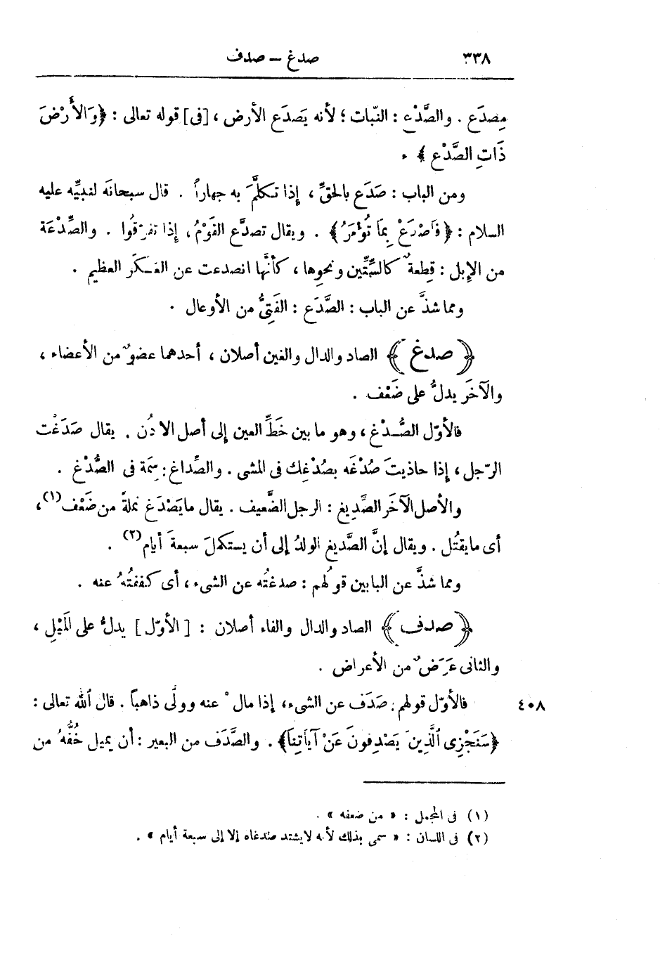 فَالْأَوَّلُ قَوْلُهُمْ: صَدَفَ عَنِ الشَّيْءِ، إِذَا مَالَ عَنْهُ وَوَلَّى ذَاهِبًا. قَالَ اللَّهُ تَعَالَى: {سَنَجْزِي الَّذِينَ يَصْدِفُونَ عَنْ آيَاتِنَا} [الأنعام: 157] . وَالصَّدَفُ مِنَ الْبَعِيرِ: أَنْ يَمِيلَ خُفُّهُ مِنَ