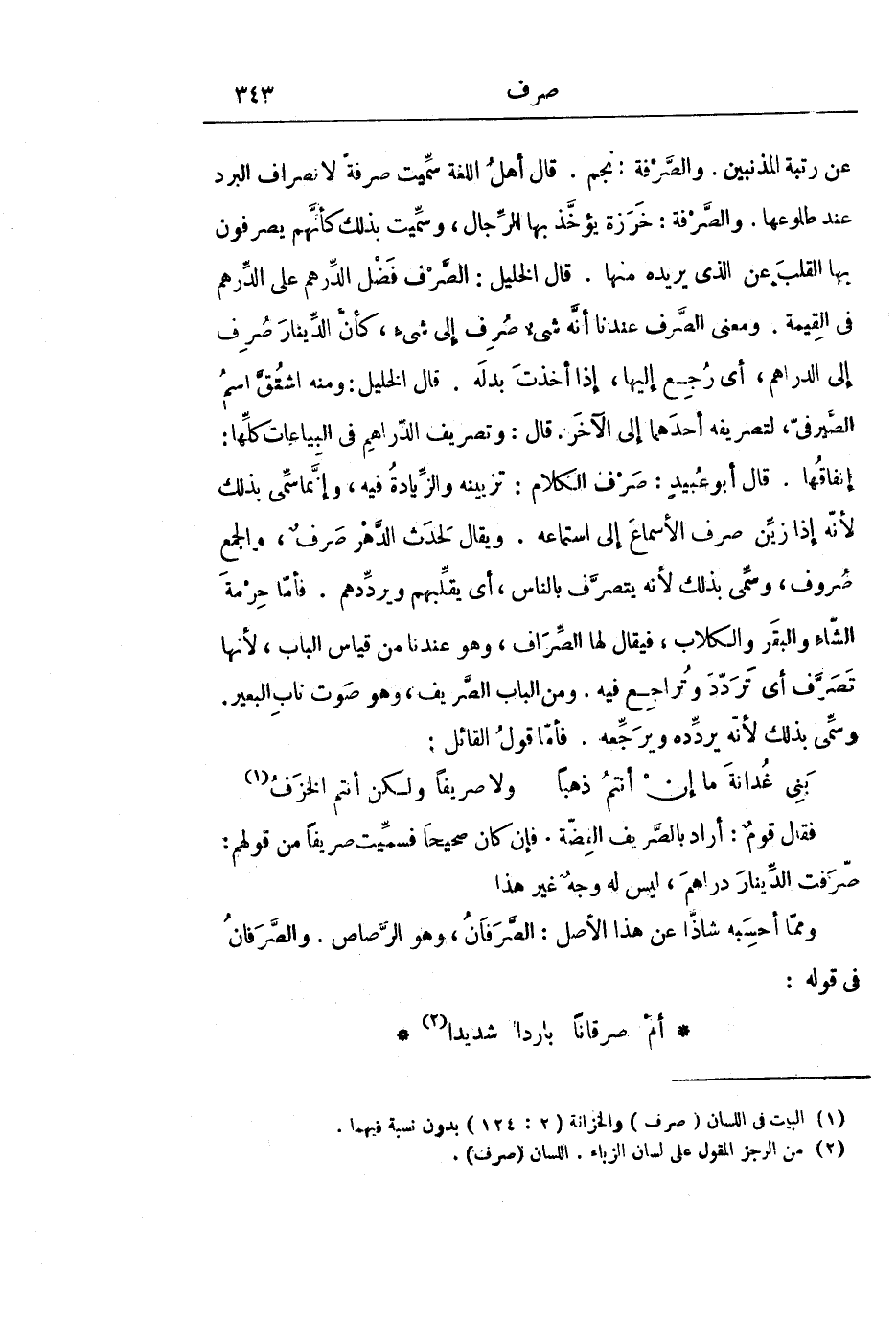 عَنْ رُتْبَةِ الْمُذْنِبِينَ. وَالصَّرْفَةُ: نَجْمٌ. قَالَ أَهْلُ اللُّغَةِ: سُمِّيَتْ صِرْفَةً لِانْصِرَافِ الْبَرْدِ عِنْدَ طُلُوعِهَا. وَالصَّرْفَةُ: خَرَزَةٌ يُؤَخَّذُ بِهَا الرِّجَالُ، وَسُمِّيَتْ بِذَلِكَ كَأَنَّهُمْ يَصْرِفُونَ بِهَا الْقَلْبَ عَنِ الَّذِي يُرِيدُهُ مِنْهَا. قَالَ الْخَلِيلُ: الصَّرْفُ فَضْلُ الدِّرْهَمِ عَلَى الدِّرْهَمِ فِي الْقِيمَةِ. وَمَعْنَى الصَّرْفِ عِنْدَنَا أَنَّهُ شَيْءٌ صُرِفَ إِلَى شَيْءٍ، كَأَنَّ الدِّينَارَ صُرِفَ إِلَى الدَّرَاهِمِ، أَيْ رُجِعَ إِلَيْهَا، إِذَا أَخَذْتَ بَدَلَهُ. قَالَ الْخَلِيلُ: وَمِنْهُ اشْتُقَّ اسْمُ الصَّيْرَفِيِّ ; لِتَصْرِيفِهِ أَحَدَهُمَا إِلَى الْآخَرِ. قَالَ: وَتَصْرِيفُ الدَّرَاهِمِ فِي الْبِيَاعَاتِ كُلِّهَا: إِنْفَاقُهَا. قَالَ أَبُو عُبَيْدٍ: صَرْفُ الْكَلَامِ: تَزْيِينُهُ وَالزِّيَادَةُ فِيهِ، وَإِنَّمَا سُمِّيَ بِذَلِكَ لِأَنَّهُ إِذَا زُيِّنَ صَرَفَ الْأَسْمَاعَ إِلَى اسْتِمَاعِهِ. وَيُقَالُ لِحَدَثِ الدَّهْرِ: صَرْفٌ، وَالْجَمْعُ: صُرُوفٌ، وَسُمِّي بِذَلِكَ لِأَنَّهُ يَتَصَرَّفُ بِالنَّاسِ، أَيْ يُقَلِّبُهُمْ وَيُرَدِّدُهُمْ. فَأَمَّا حِرْمَةُ الشَّاءِ وَالْبَقَرِ وَالْكِلَابِ، فَيُقَالُ لَهَا: الصِّرَافُ، وَهُوَ عِنْدَنَا مِنْ قِيَاسِ الْبَابِ ; لِأَنَّهَا تَصَرَّفُ أَيْ تَرَدَّدُ وَتُرَاجِعُ فِيهِ. وَمِنَ الْبَابِ: الصَّرِيفُ، وَهُوَ صَوْتُ نَابِ الْبَعِيرِ. وَسُمِّيَ بِذَلِكَ لِأَنَّهُ يُرَدِّدُهُ وَيُرَجِّعُهُ. فَأَمَّا قَوْلُ الْقَائِلِ: