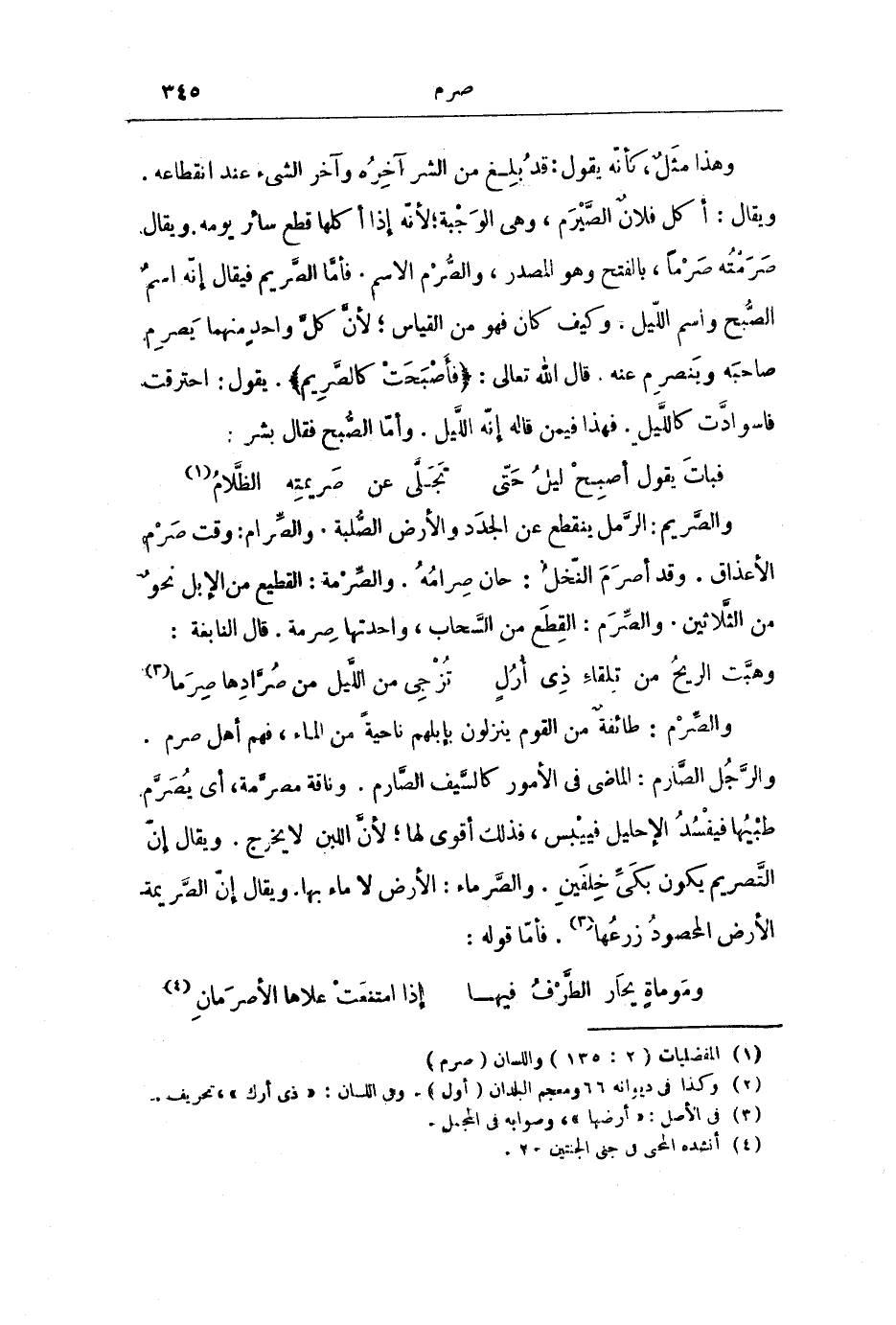وَهَذَا مَثَلٌ، كَأَنَّهُ يَقُولُ: قَدْ بُلِغَ مِنَ الشَّرِّ آخِرُهُ، وَآخِرُ الشَّيْءِ عِنْدَ انْقِطَاعِهِ. وَيُقَالُ: أَكَلَ فُلَانٌ الصَّيْرَمَ، وَهِيَ الْوَجْبَةُ ; لِأَنَّهُ إِذَا أَكَلَهَا قَطَعَ سَائِرَ يَوْمِهِ. وَيُقَالُ: صَرَمْتُهُ صَرْمًا، بِالْفَتْحِ، وَهُوَ الْمَصْدَرُ، وَالصُّرْمُ الِاسْمُ. فَأَمَّا الصَّرِيمُ فَيُقَالُ: إِنَّهُ اسْمُ الصُّبْحِ وَاسْمُ اللَّيْلِ. وَكَيْفَ كَانَ فَهُوَ مِنَ الْقِيَاسِ ; لِأَنَّ كُلَّ وَاحِدٍ مِنْهُمَا يَصْرِمُ صَاحِبَهُ وَيَنْصَرِمُ عَنْهُ. قَالَ اللَّهُ تَعَالَى: {فَأَصْبَحَتْ كَالصَّرِيمِ} [القلم: 20] . يَقُولُ: احْتَرَقَتْ فَاسْوَادَّتْ كَاللَّيْلِ. فَهَذَا فِيمَنْ قَالَهُ إِنَّهُ اللَّيْلُ. وَأَمَّا الصُّبْحُ فَقَالَ بِشْرٌ: