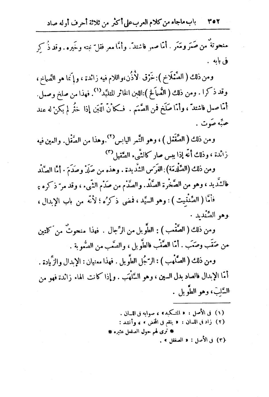 وَمِنْ ذَلِكَ (الصِّلْدَمَةُ) الْفَرَسُ الشَّدِيدَةُ. وَهَذِهِ مِنْ صَلَدَ وَصَدَمَ. أَمَّا الصَّلْدُ فَالشَّدِيدُ، وَهُوَ مِنَ الصَّخْرَةِ الصَّلْدِ. وَالصَّدْمُ مِنْ صَدْمِ الشَّيْءِ، وَقَدْ مَرَّ ذِكْرُهُ. فَأَمَّا (الصِّنْتِيتُ) وَهُوَ السَّيِّدُ، فَمَضَى ذِكْرُهُ ; لِأَنَّهُ مِنْ بَابِ الْإِبْدَالِ، وَهُوَ الصِّنْدِيدُ.