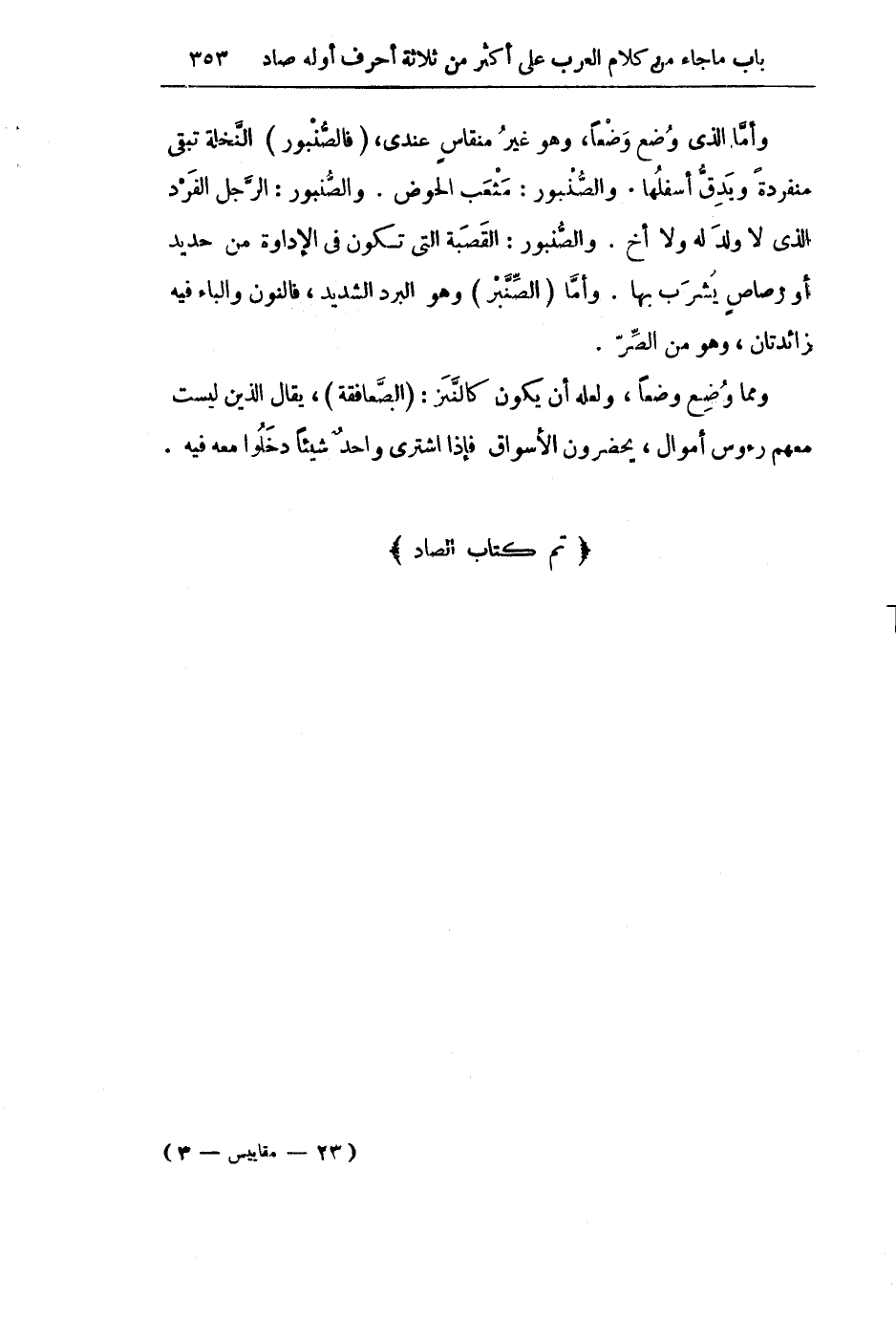 وَأَمَّا الَّذِي وُضِعَ وَضْعًا، وَهُوَ غَيْرُ مُنْقَاسٍ عِنْدِي، (فَالصُّنْبُورُ) النَّخْلَةُ تَبْقَى مُنْفَرِدَةً وَيَدِقُّ أَسْفَلُهَا. وَالصُّنْبُورُ: مَثْعَبُ الْحَوْضِ. وَالصُّنْبُورُ: الرَّجُلُ الْفَرْدُ الَّذِي لَا وَلَدَ لَهُ وَلَا أَخَ. وَالصُّنْبُورُ: الْقَصَبَةُ الَّتِي تَكُونُ فِي الْإِدَاوَةِ مِنْ حَدِيدٍ أَوْ رَصَاصٍ يُشْرَبُ بِهَا. وَأَمَّا (الصِّنَّبْرُ) وَهُوَ الْبَرْدُ الشَّدِيدُ، فَالنُّونُ وَالْبَاءُ فِيهِ زَائِدَتَانِ، وَهُوَ مِنَ الصِّرِّ.