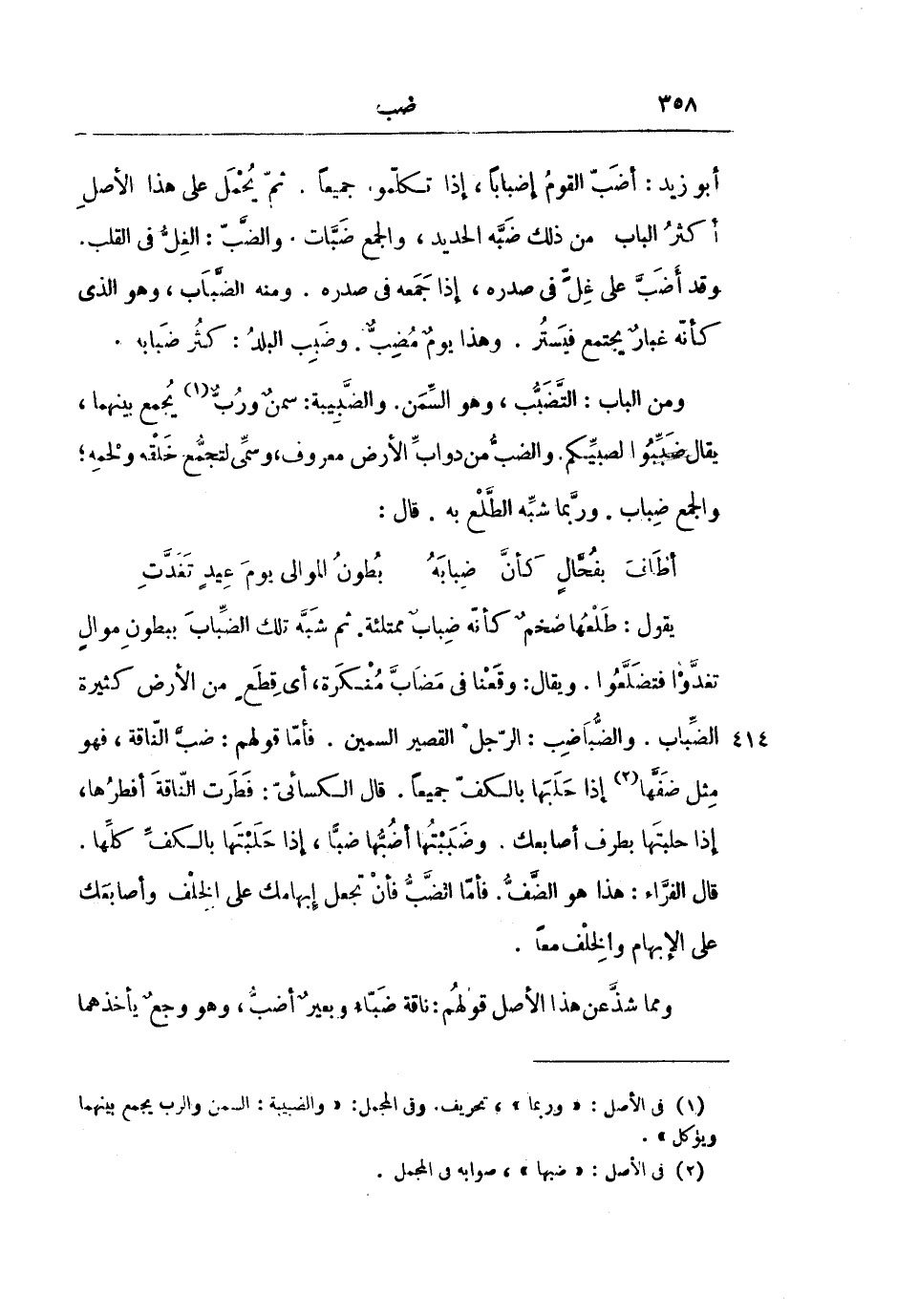 يَقُولُ: طَلْعُهَا ضَخْمٌ كَأَنَّهُ ضِبَابٌ مُمْتَلِئَةٌ. ثُمَّ شَبَّهَ تِلْكَ الضِّبَابَ بِبُطُونِ مَوَالٍ تَغَدَّوْا فَتَضَلَّعُوا. وَيُقَالُ: وَقَعْنَا فِي مَضَابَّ مُنْكَرَةٍ، أَيْ قِطَعٍ مِنَ الْأَرْضِ كَثِيرَةِ الضِّبَابِ. وَالضُّبَاضِبُ: الرَّجُلُ الْقَصِيرُ السَّمِينُ. فَأَمَّا قَوْلُهُمْ: ضَبَّ النَّاقَةَ، فَهُوَ مِثْلُ ضَفَّهَا، إِذَا حَلَبَهَا بِالْكَفِّ جَمِيعًا. قَالَ الْكِسَائِيُّ: فَطَرْتُ النَّاقَةَ أَفْطِرُهَا، إِذَا حَلَبْتَهَا بِطَرَفِ أَصَابِعِكَ. وَضَبَبْتُهَا أَضُبُّهَا ضَبًّا، إِذَا حَلَبْتَهَا بِالْكَفِّ كُلِّهَا. قَالَ الْفَرَّاءُ: هَذَا هُوَ الضَّفُّ. فَأَمَّا الضَّبُّ فَأَنْ تَجْعَلَ إِبْهَامَكَ عَلَى الْخِلْفِ وَأَصَابِعَكَ عَلَى الْإِبْهَامِ وَالْخِلْفِ مَعًا.