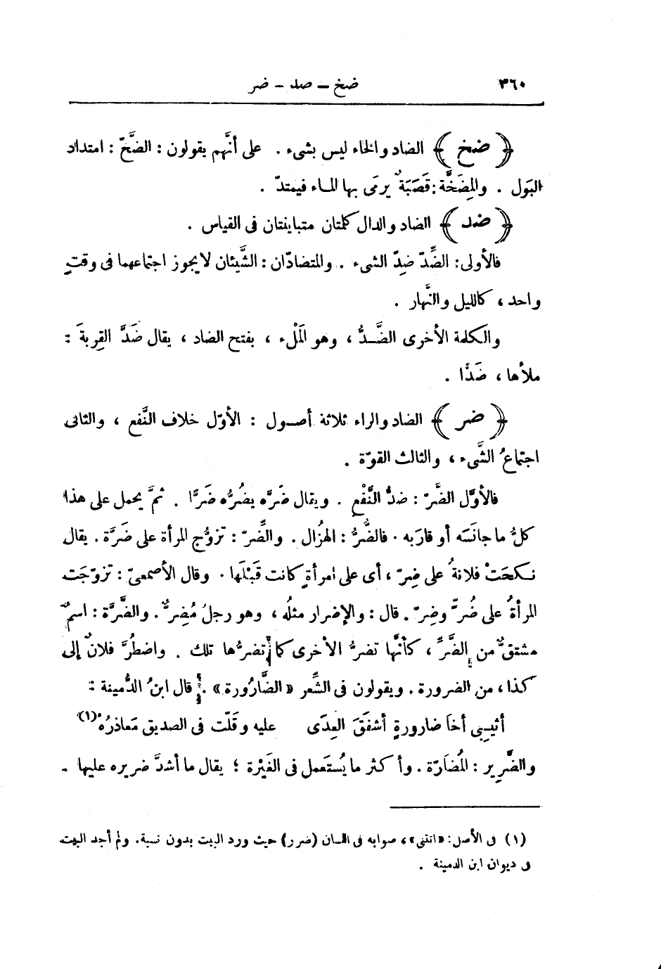 فَالْأَوَّلُ الضَّرُّ: ضِدُ النَّفْعِ. وَيُقَالُ: ضَرَّهُ يَضُرُّهُ ضَرًّا. ثُمَّ يُحْمَلُ عَلَى هَذَا كُلُّ مَا جَانَسَهُ أَوْ قَارَبَهُ. فَالضُّرُّ: الْهُزَالُ. وَالضِّرُّ: تَزَوُّجُ الْمَرْأَةِ عَلَى ضَرَّةٍ. يُقَالُ: نُكِحَتْ فُلَانَةُ عَلَى ضِرٍّ، أَيْ عَلَى امْرَأَةٍ كَانَتْ قَبْلَهَا. وَقَالَ الْأَصْمَعِيُّ: تَزَوَّجَتِ الْمَرْأَةُ عَلَى ضُرٍّ وَضِرٍّ. قَالَ: وَالْإِضْرَارُ مِثْلُهُ، وَهُوَ رَجُلٌ مُضِرٌّ. وَالضَّرَّةُ: اسْمٌ مُشْتَقٌّ مِنَ الضَّرِّ، كَأَنَّهَا تَضُرُّ الْأُخْرَى كَمَا تَضُرُّهَا تِلْكَ. وَاضْطَرَّ فُلَانٌ إِلَى كَذَا، مِنَ الضَّرُورَةِ. وَيَقُولُونَ فِي الشِّعْرِ " الضَّارُورَةُ ". قَالَ ابْنُ الدُّمَيْنَةِ: