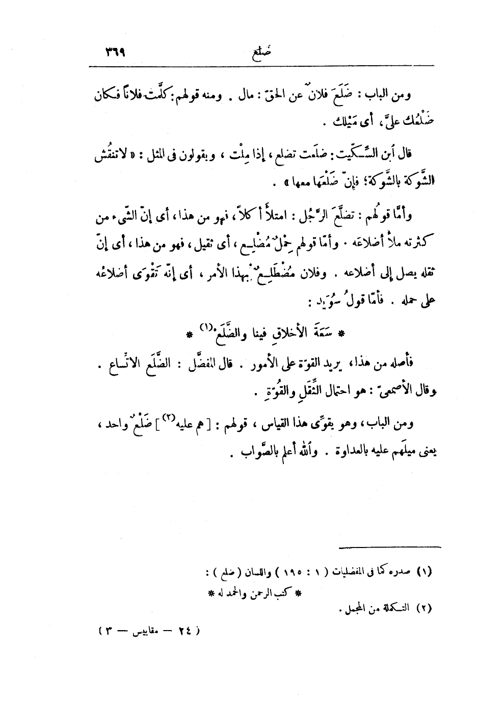 فَأَصْلُهُ مِنْ هَذَا، يُرِيدُ الْقُوَّةَ عَلَى الْأُمُورِ. قَالَ الْمُفَضَّلُ: الضَّلَعُ الِاتِّسَاعُ. وَقَالَ الْأَصْمَعِيُّ: هُوَ احْتِمَالُ الثِّقَلِ وَالْقُوَّةِ. وَمِنَ الْبَابِ، وَهُوَ يُقَوِّي هَذَا الْقِيَاسَ، قَوْلُهُمْ: [هُمْ عَلَيْهِ] ضَلْعٌ وَاحِدٌ، يَعْنِي مَيْلَهُمْ عَلَيْهِ بِالْعَدَاوَةِ. وَاللَّهُ أَعْلَمُ بِالصَّوَابِ.
