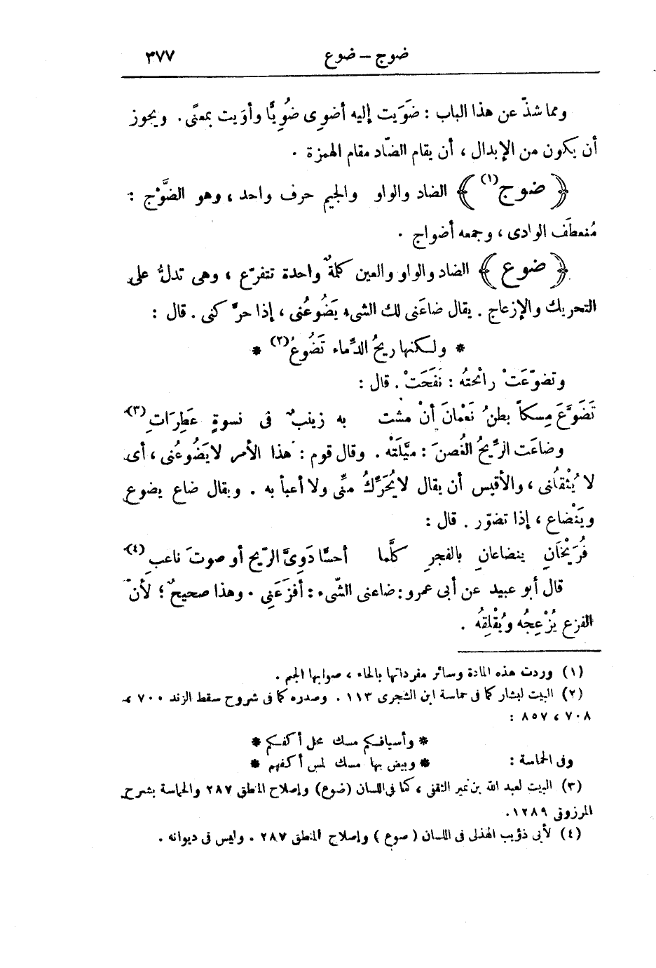 وَمِمَّا شَذَّ عَنْ هَذَا الْبَابِ: ضَوَيْتُ إِلَيْهِ أَضْوِي ضُوِيًّا وَأَوَيْتُ بِمَعْنًى. وَيَجُوزُ أَنْ يَكُونَ مِنَ الْإِبْدَالِ، أَنْ يُقَامَ الضَّادُ مَقَامَ الْهَمْزَةِ.