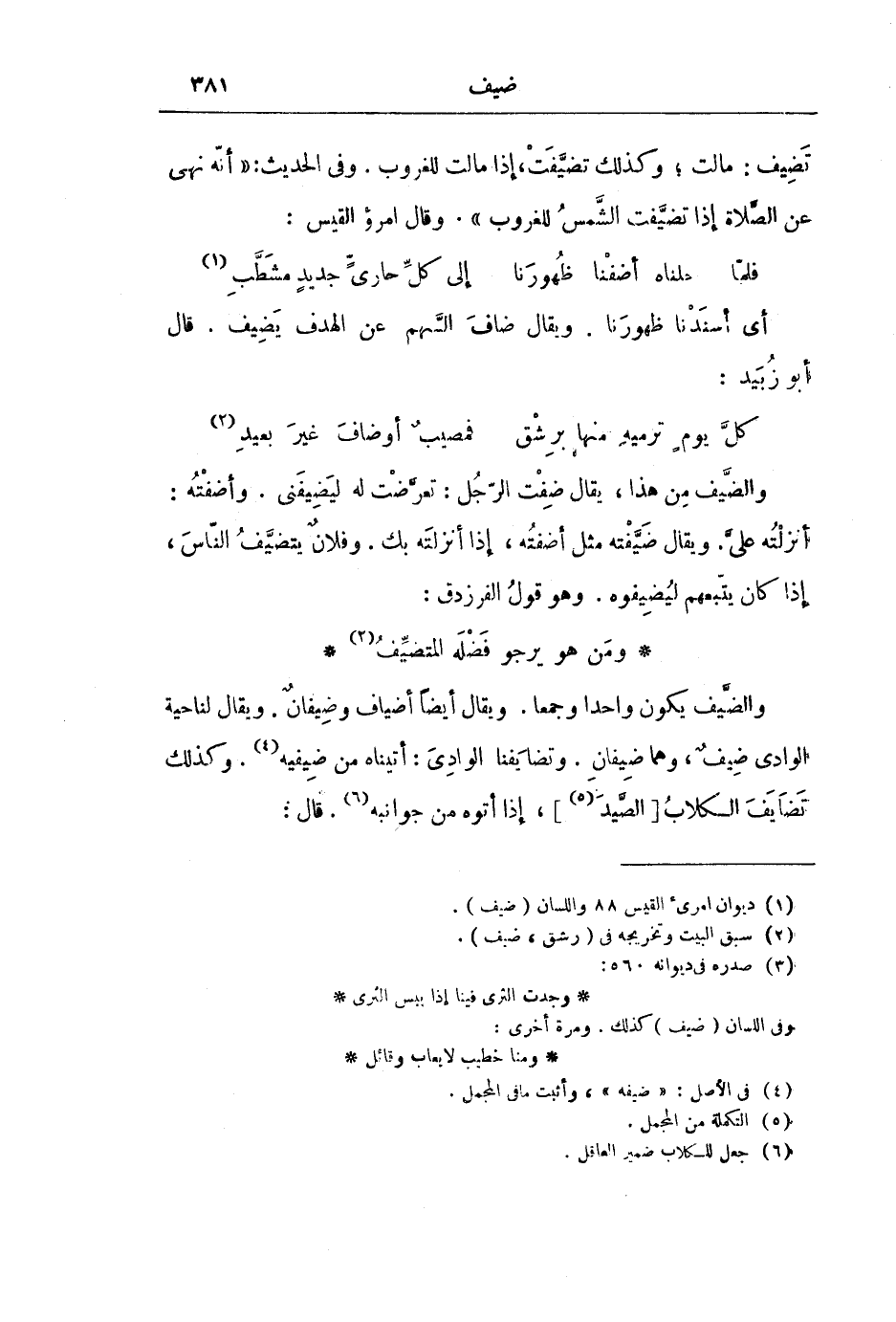تَضِيفُ: مَالَتْ ; وَكَذَلِكَ تَضَيَّفَتْ، إِذَا مَالَتْ لِلْغُرُوبِ. وَفِي الْحَدِيثِ: «أَنَّهُ نَهَى عَنِ الصَّلَاةِ إِذَا تَضَيَّفَتِ الشَّمْسُ لِلْغُرُوبِ» . وَقَالَ امْرُؤُ الْقَيْسِ: