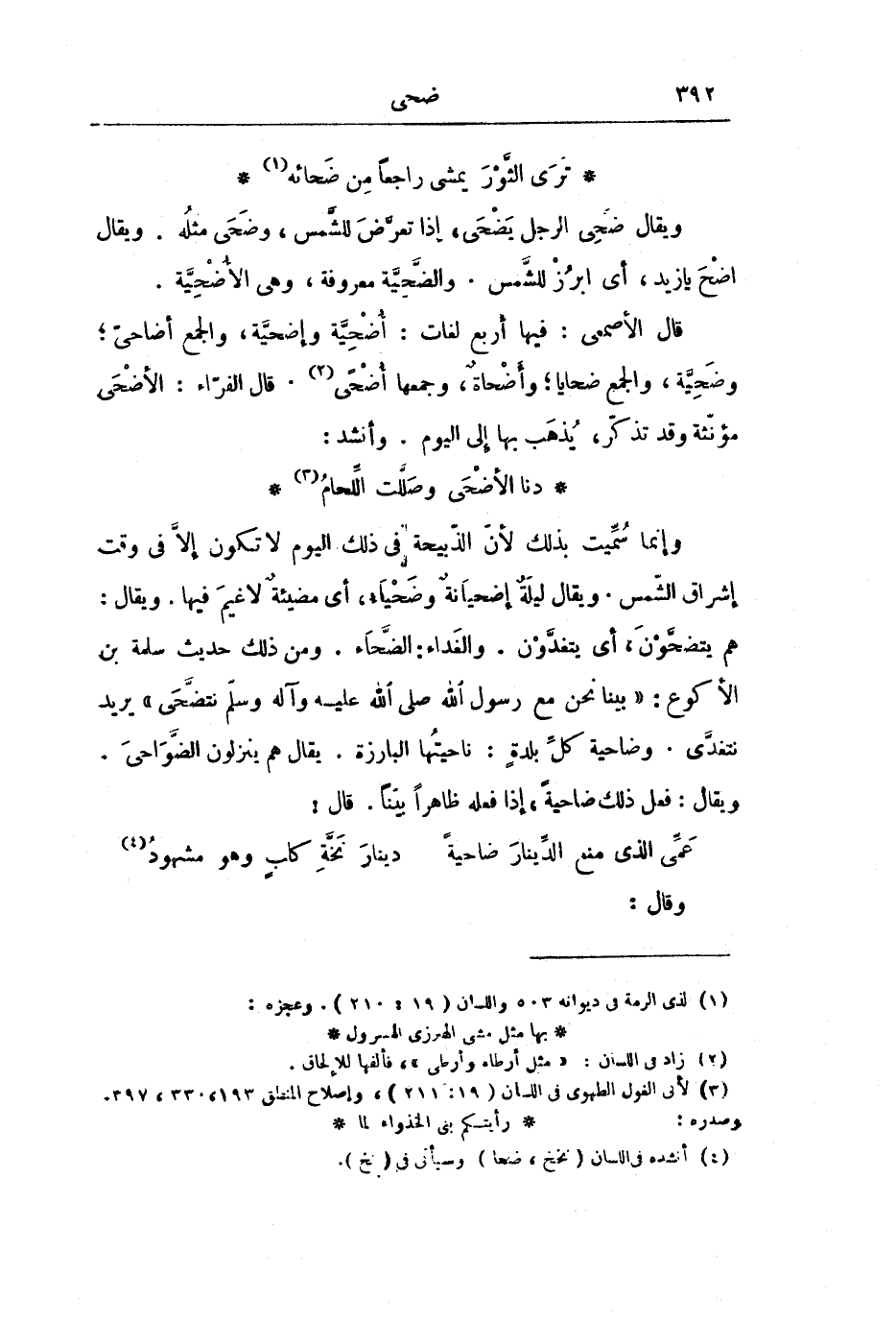 وَإِنَّمَا سُمِّيَتْ بِذَلِكَ لِأَنَّ الذَّبِيحَةَ فِي ذَلِكَ الْيَوْمِ لَا تَكُونُ إِلَّا فِي وَقْتِ إِشْرَاقِ الشَّمْسِ. وَيُقَالُ: لَيْلَةٌ إِضْحِيَانَةٌ وَضَحْيَاءُ، أَيْ مُضِيئَةٌ لَا غَيْمَ فِيهَا. وَيُقَالُ: هُمْ يَتَضَحَّوْنَ، أَيْ يَتَغَدَّوْنَ. وَالْغَدَاءُ: الضَّحَاءُ. وَمِنْ ذَلِكَ حَدِيثُ سَلَمَةَ بْنِ الْأَكْوَعِ: «بَيْنَا نَحْنُ مَعَ رَسُولِ اللَّهِ - صَلَّى اللَّهُ عَلَيْهِ وَآلِهِ وَسَلَّمَ - نَتَضَحَّى» - يُرِيدُ نَتَغَدَّى. وَضَاحِيَةُ كُلِّ بَلْدَةٍ: نَاحِيَتُهَا الْبَارِزَةُ. يُقَالُ: هُمْ يَنْزِلُونَ الضَّوَاحِيَ. وَيُقَالُ: فَعَلَ ذَلِكَ ضَاحِيَةً، إِذَا فَعَلَهُ ظَاهِرًا بَيِّنًا. قَالَ: