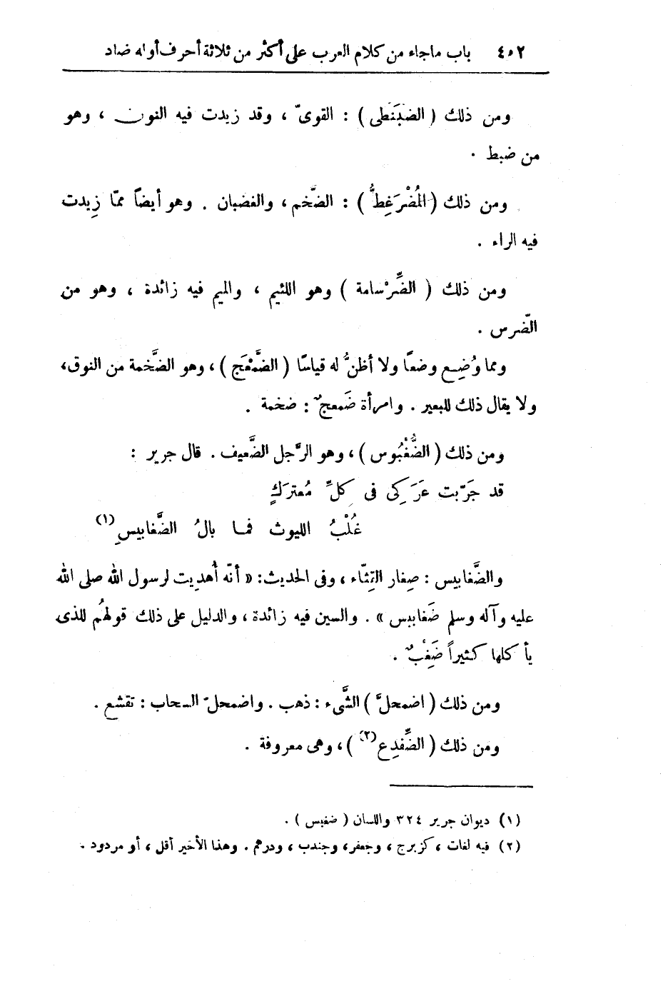 وَمِنْ ذَلِكَ (الْمُضَرْغِطُّ) : الضَّخْمُ، وَالْغَضْبَانُ. وَهُوَ أَيْضًا مِمَّا زِيدَتْ فِيهِ الرَّاءُ.