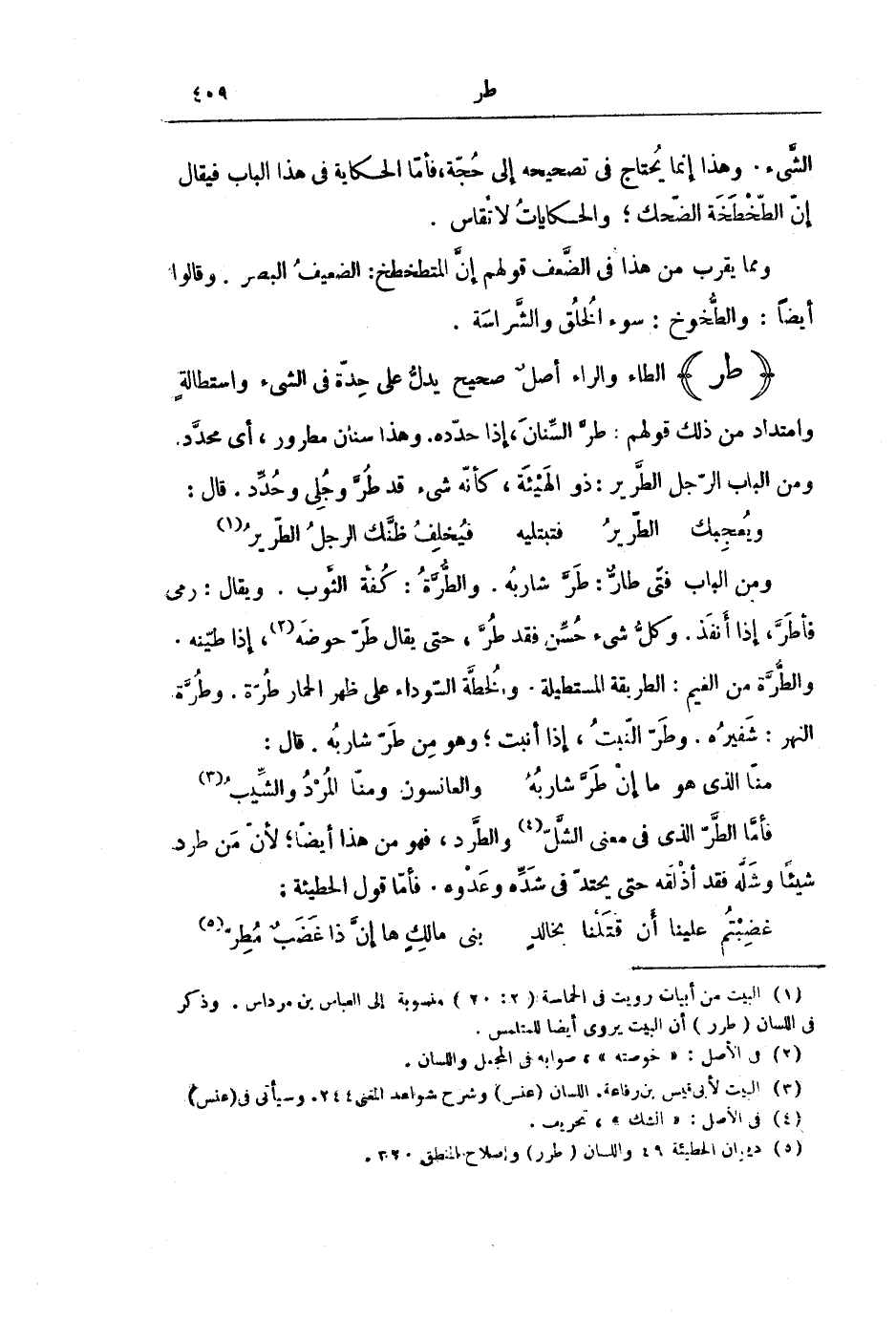 فَأَمَّا الطَّرُّ الَّذِي فِي مَعْنَى الشَّلِّ وَالطَّرْدِ، فَهُوَ مِنْ هَذَا أَيْضًا ; لِأَنَّ مَنْ طَرَدَ شَيْئًا وَشَلَّهُ فَقَدْ أَذْلَقَهُ حَتَّى يَحْتَدَّ فِي شَدِّهِ وَعَدْوِهِ. فَأَمَّا قَوْلُ الْحُطَيْئَةِ: