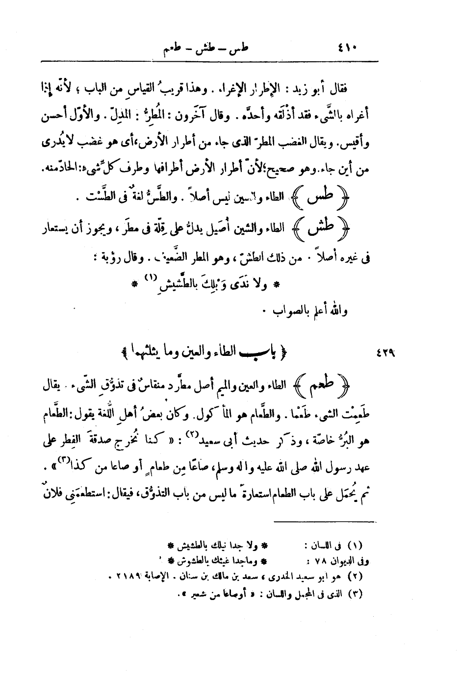 (طَعَمَ) الطَّاءُ وَالْعَيْنُ وَالْمِيمُ أَصْلٌ مُطَّرِدٌ مُنْقَاسٌ فِي تَذَوُّقِ الشَّيْءِ. يُقَالُ: طَعِمْتُ الشَّيْءَ طَعْمًا. وَالطَّعَامُ هُوَ الْمَأْكُولُ. وَكَانَ بَعْضُ أَهْلُ اللُّغَةِ يَقُولُ: الطَّعَامُ هُوَ الْبُرُّ خَاصَّةً، وَذَكَرَ حَدِيثَ أَبِي سَعِيدٍ: «كُنَّا نُخْرِجُ صَدَقَةَ الْفِطْرِ عَلَى عَهْدِ رَسُولِ اللَّهِ - صَلَّى اللَّهُ عَلَيْهِ وَآلِهِ وَسَلَّمَ - صَاعًا مِنْ طَعَامٍ أَوْ صَاعًا مِنْ كَذَا» . ثُمَّ يُحْمَلُ عَلَى بَابِ الطَّعَامِ اسْتِعَارَةً مَا لَيْسَ مِنْ بَابِ التَّذَوُّقِ، فَيُقَالُ: اسْتَطْعَمَنِي فُلَانٌ