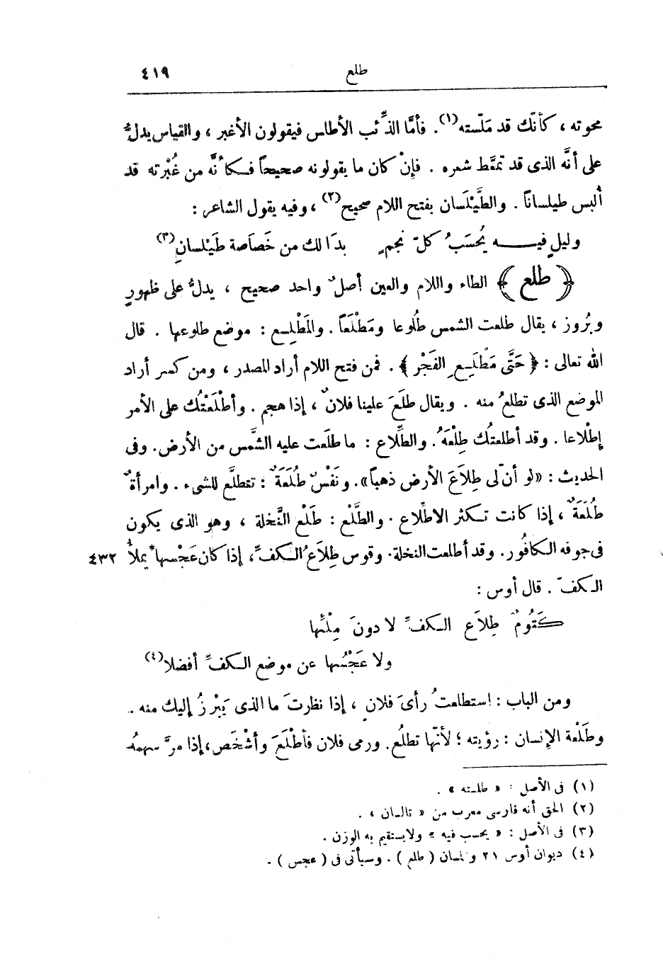 (طَلَعَ) الطَّاءُ وَاللَّامُ وَالْعَيْنُ أَصْلٌ وَاحِدٌ صَحِيحٌ، يَدُلُّ عَلَى ظُهُورٍ وَبُرُوزٍ، يُقَالُ: طَلَعَتِ الشَّمْسُ طُلُوعًا وَمَطْلَعًا. وَالْمَطْلِعُ: مَوْضِعُ طُلُوعِهَا. قَالَ اللَّهُ تَعَالَى: {حَتَّى مَطْلَعِ الْفَجْرِ} [القدر: 5] . فَمَنْ فَتَحَ اللَّامَ أَرَادَ الْمَصْدَرَ، وَمَنْ كَسَرَ أَرَادَ الْمَوْضِعَ الَّذِي تَطَّلِعُ مِنْهُ. وَيُقَالُ طَلَعَ عَلَيْنَا فُلَانٌ، إِذَا هَجَمَ. وَأَطْلَعْتُكَ عَلَى الْأَمْرِ إِطْلَاعًا. وَقَدْ أَطْلَعْتُكَ طِلْعَهُ. وَالطِّلَاعُ: مَا طَلَعَتْ عَلَيْهِ الشَّمْسُ مِنَ الْأَرْضِ. وَفِي الْحَدِيثِ: «لَوْ أَنَّ لِي طِلَاعَ الْأَرْضِ ذَهَبًا» . وَنَفْسٌ طُلَعَةٌ: تَتَطَلَّعُ لِلشَّيْءِ. وَامْرَأَةٌ طُلَعَةٌ، إِذَا كَانَتْ تُكْثِرُ الِاطِّلَاعَ. وَالطَّلْعُ: طَلْعُ النَّخْلَةِ، وَهُوَ الَّذِي يَكُونُ فِي جَوْفِهِ الْكَافُورُ، وَقَدْ أَطْلَعَتِ النَّخْلَةُ. وَقَوْسٌ طِلَاعُ الْكَفِّ، إِذَا كَانَ عَجْسُهَا يَمْلَأُ الْكَفَّ. قَالَ أَوْسٌ: