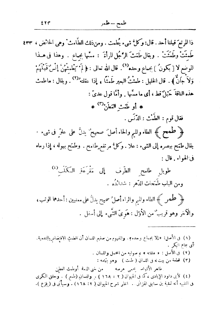ذَا الْمَرْتَعَ قَبْلَنَا أَحَدٌ. قَالَ: وَكُلُّ شَيْءٍ يُطْمَثُ. وَمِنْ ذَلِكَ الطَّامِثُ، وَهِيَ الْحَائِضُ. طَمِثَتْ وَطَمَثَتْ. وَيُقَالُ: طَمَثَ الرَّجُلُ الْمَرْأَةَ: مَسَّهَا بِجِمَاعٍ. وَهَذَا فِي هَذَا الْمَوْضِعِ لَا [يَكُونُ] بِجِمَاعٍ وَحْدَهُ. قَالَ اللَّهُ تَعَالَى: {لَمْ يَطْمِثْهُنَّ إِنْسٌ قَبْلَهُمْ وَلَا جَانٌّ} [الرحمن: 56] ، قَالَ الْخَلِيلُ: طَمَثْتُ الْبَعِيرَ طَمْثًا، إِذَا عَقَلْتَهُ. وَيُقَالُ: مَا طَمَثَ هَذِهِ النَّاقَةَ حَبْلٌ قَطُّ. أَيْ مَا مَسَّهَا. وَأَمَّا قَوْلُ عَدِيٍّ: