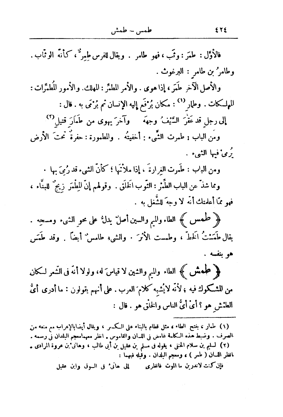 فَالْأَوَّلُ: طَمَرَ: وَثَبَ ; فَهُوَ طَامِرٌ. وَيُقَالُ لِلْفَرَسِ: طِمِرٌّ، كَأَنَّهُ الْوَثَّابُ. وَطَامِرُ بْنُ طَامِرٍ: الْبُرْغُوثُ. وَالْأَصْلُ الْآخَرُ: طَمَرَ، إِذَا هَوَى. وَالْأَمْرُ الْمُطَمِّرُ: الْمُهْلِكُ. وَالْأُمُورُ الْمُطَمِّرَاتُ: الْمُهْلِكَاتُ. وَطَمَارِ: مَكَانٌ يُرْفَعُ إِلَيْهِ الْإِنْسَانُ ثُمَّ يُرْمَى بِهِ. قَالَ: