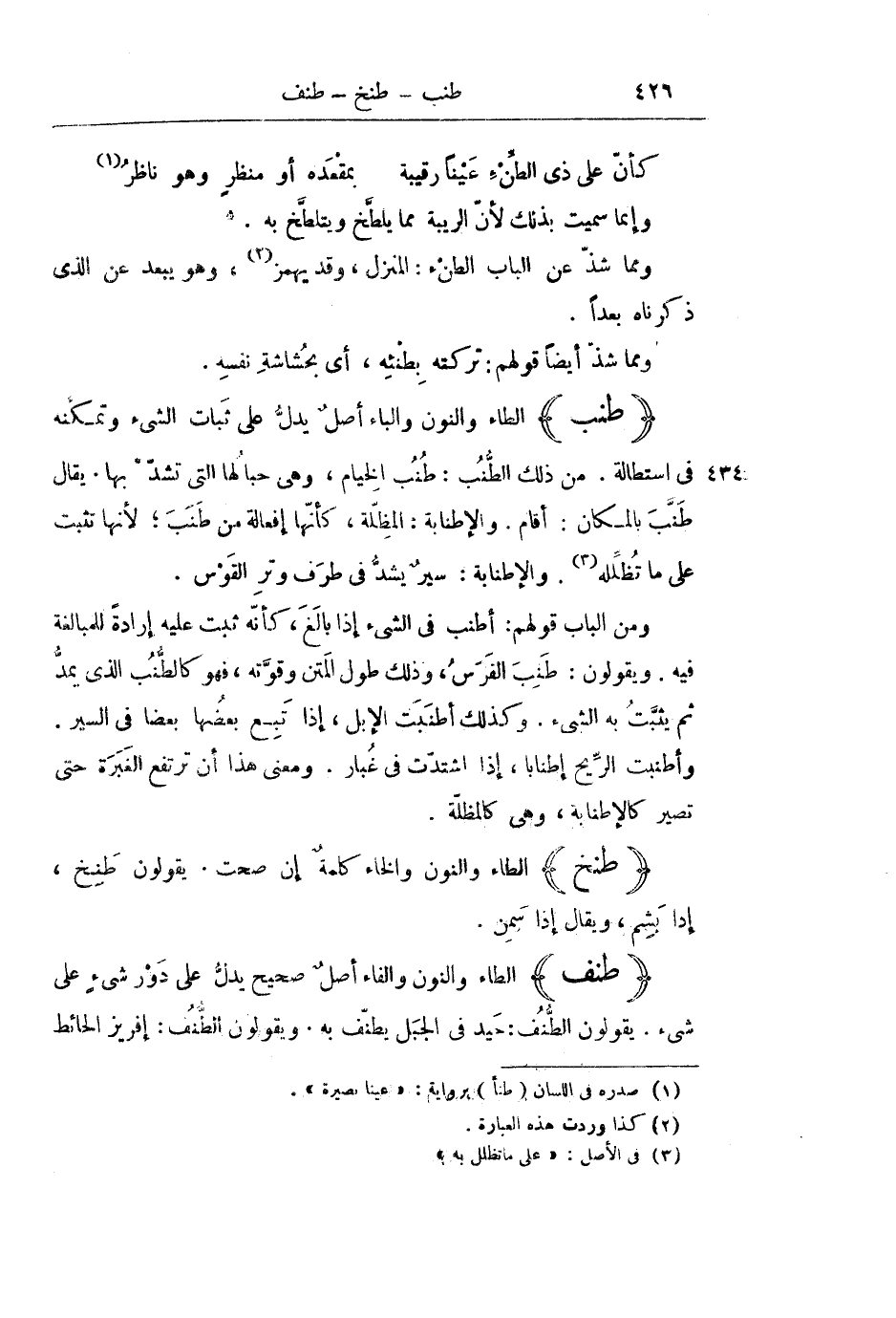وَإِنَّمَا سُمِّيَتْ بِذَلِكَ لِأَنَّ الرِّيبَةَ مِمَّا يُلَطَّخُ وَيُتَلَطَّخُ بِهِ. وَمِمَّا شَذَّ عَنِ الْبَابِ الطَّنْءُ: الْمَنْزِلُ، وَقَدْ يُهْمَزُ، وَهُوَ يَبْعُدُ عَنِ الَّذِي ذَكَرْنَاهُ بُعْدًا.