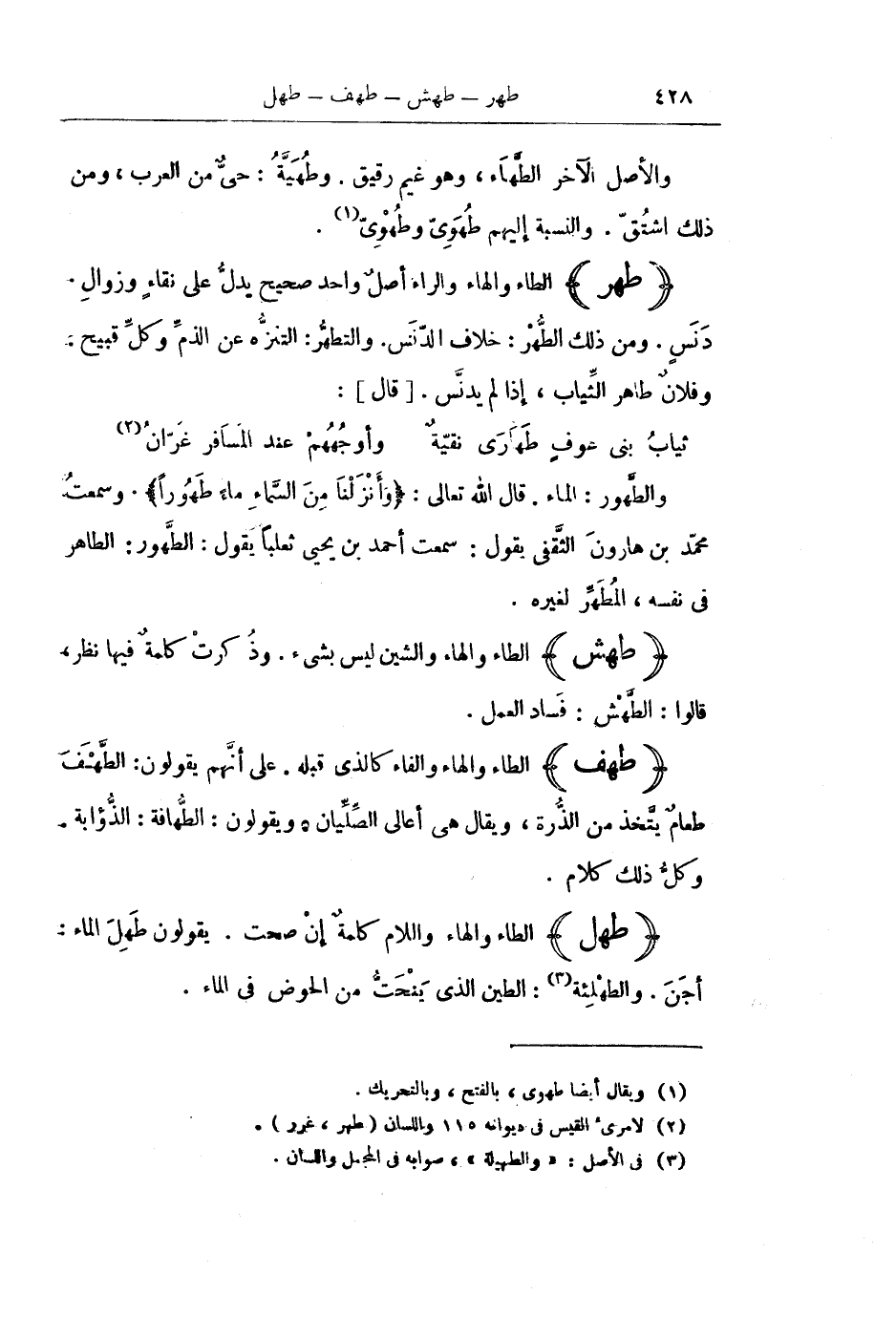 (طَهَرَ) الطَّاءُ وَالْهَاءُ وَالرَّاءُ أَصْلٌ وَاحِدٌ صَحِيحٌ يَدُلُّ عَلَى نَقَاءٍ وَزَوَالِ دَنَسٍ. وَمِنْ ذَلِكَ الطُّهْرُ، خِلَافُ الدَّنَسِ. وَالتَّطَهُّرُ: التَّنَزُّهُ عَنِ الذَّمِّ وَكُلِّ قَبِيحٍ. وَفُلَانٌ طَاهِرُ الثِّيَابِ، إِذَا لَمْ يُدَنَّسُ. [قَالَ] :