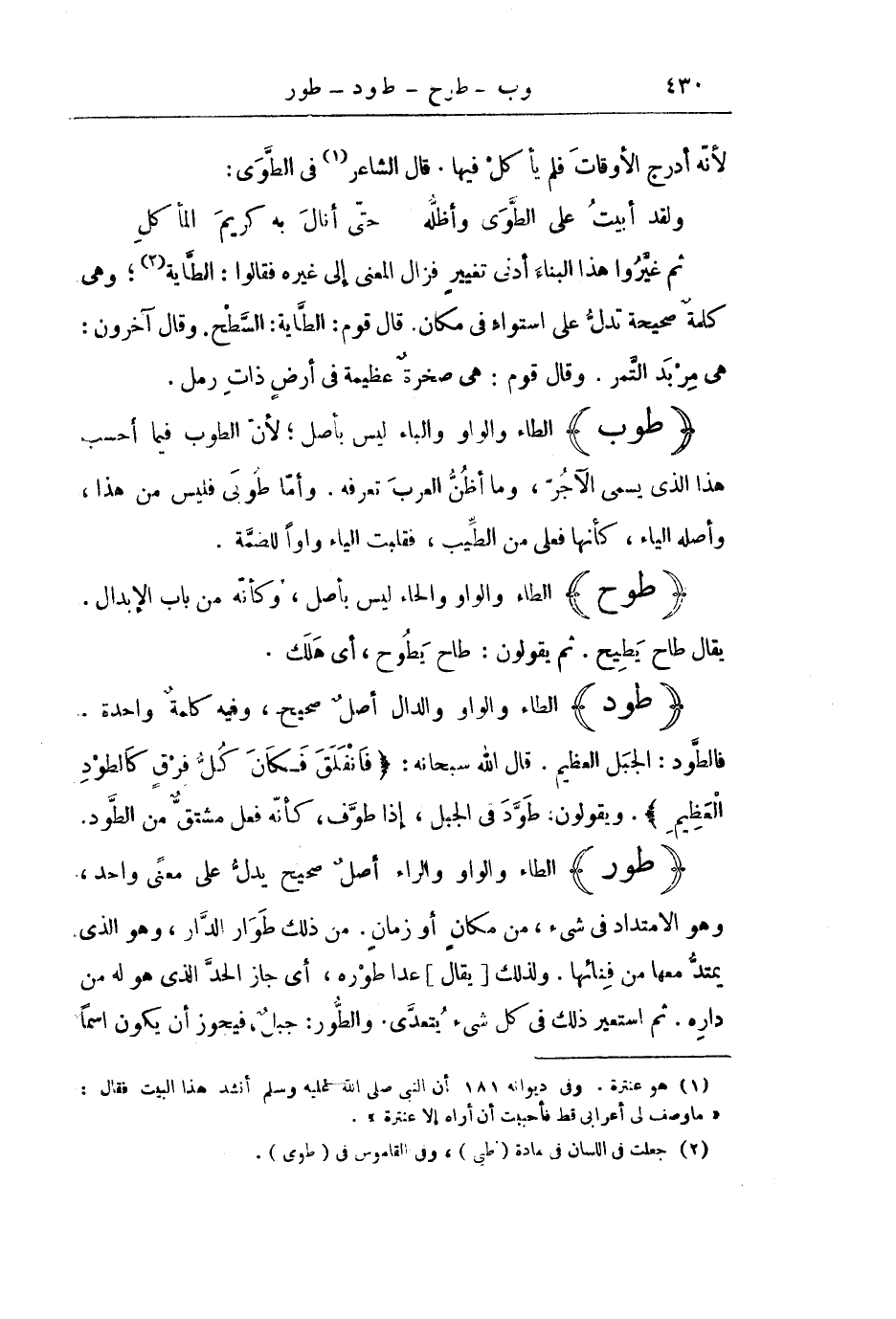 (طَوَرَ) الطَّاءُ وَالْوَاوُ وَالرَّاءُ أَصْلٌ صَحِيحٌ يَدُلُّ عَلَى مَعْنًى وَاحِدٍ، وَهُوَ الِامْتِدَادُ فِي شَيْءٍ مِنْ مَكَانٍ أَوْ زَمَانٍ. مِنْ ذَلِكَ طَوَارُ الدَّارِ، وَهُوَ الَّذِي يَمْتَدُّ مَعَهَا مِنْ فِنَائِهَا. وَلِذَلِكَ [يُقَالُ] عَدَا طَوْرَهُ، أَيْ جَازَ الْحَدُّ الَّذِي هُوَ لَهُ مِنْ دَارِهِ. ثُمَّ اسْتُعِيرَ ذَلِكَ فِي كُلِّ شَيْءٍ يُتَعَدَّى. وَالطُّورُ: جَبَلٌ، فَيَجُوزُ أَنْ يَكُونَ اسْمًا