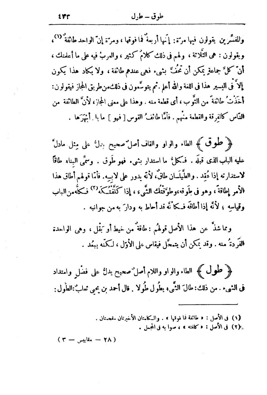 وَالْمُفَسِّرِينَ يَقُولُونَ فِيهَا مَرَّةً: إِنَّهَا أَرْبَعَةٌ فَمَا فَوْقَهَا، وَمَرَّةً: إِنَّ الْوَاحِدَ طَائِفَةٌ، وَيَقُولُونَ: هِيَ الثَّلَاثَةُ، وَلَهُمْ فِي ذَلِكَ كَلَامٌ كَثِيرٌ، وَالْعَرَبُ فِيهِ عَلَى مَا أَعْلَمْتُكَ، أَنَّ كُلَّ جَمَاعَةٍ يُمْكِنُ أَنْ تَحُفَّ بِشَيْءٍ فَهِيَ عِنْدَهُمْ طَائِفَةٌ، وَلَا يَكَادُ هَذَا يَكُونُ إِلَّا فِي الْيَسِيرِ هَذَا فِي اللُّغَةِ، وَاللَّهُ أَعْلَمُ. ثُمَّ يَتَوَسَّعُونَ فِي ذَلِكَ مِنْ طَرِيقِ الْمَجَازِ فَيَقُولُونَ: أَخَذْتُ طَائِفَةً مِنَ الثَّوْبِ، أَيْ قِطْعَةً مِنْهُ، وَهَذَا عَلَى مَعْنَى الْمَجَازِ ; لِأَنَّ الطَّائِفَةَ مِنَ النَّاسِ كَالْفِرْقَةِ وَالْقِطْعَةِ مِنْهُمْ. فَأَمَّا طَائِفُ الْقَوْسِ [فَهُوَ] مَا يَلِي أَبْهَرَهَا.