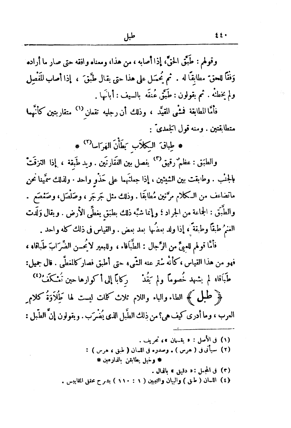 وَقَوْلُهُمْ: طَبَّقَ الْحَقَّ إِذَا أَصَابَهُ - مِنْ هَذَا، وَمَعْنَاهُ: وَافَقَهُ حَتَّى صَارَ مَا أَرَادَهُ وَفْقًا لِلْحَقِّ مُطَابِقًا لَهُ. ثُمَّ يُحْمَلُ عَلَى هَذَا حَتَّى يُقَالَ: طَبَّقَ، إِذَا أَصَابَ الْمَفْصِلَ وَلَمْ يُخْطِئْهُ. ثُمَّ يَقُولُونَ: طَبَّقَ عُنُقَهُ بِالسَّيْفِ: أَبَانَهَا.