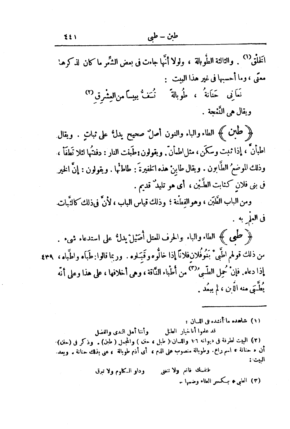 (طَبَنَ) الطَّاءُ وَالْبَاءُ وَالنُّونُ أَصْلٌ صَحِيحٌ يَدُلُّ عَلَى ثَبَاتٍ. وَيُقَالُ: اطْبَأَنَّ، إِذَا ثَبَتَ وَسَكَنَ، مِثْلُ اطْمَأَنَّ، وَيَقُولُونَ: طَبَنْتُ النَّارُ: دَفَنْتُهَا لِئَلَّا تَطْفَأَ، وَذَلِكَ الْمَوْضِعُ الطَّابُونُ. وَيُقَالُ: طَابِنْ هَذِهِ الْحَفِيرَةَ: طَاطِئْهَا. وَيَقُولُونَ: إِنَّ الْخَيْرَ فِي بَنِي فُلَانٍ كَثَابِتِ الطَّبْنِ، أَيْ هُوَ تَلِيدٌ قَدِيمٌ.