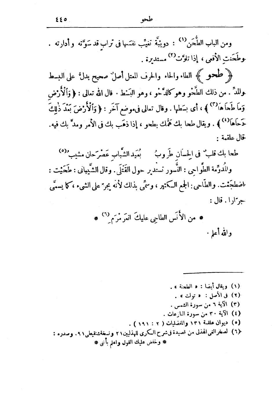 (طَحَوَ) الطَّاءُ وَالْحَاءُ وَالْحَرْفُ الْمُعْتَلُّ أَصْلٌ صَحِيحٌ يَدُلُّ عَلَى الْبَسْطِ وَالْمَدِّ. مِنْ ذَلِكَ الطَّحْوُ وَهُوَ كَالدَّحْوِ، وَهُوَ الْبَسْطُ. قَالَ اللَّهُ تَعَالَى: {وَالْأَرْضِ وَمَا طَحَاهَا} [الشمس: 6] ، أَيْ بَسَطَهَا، وَقَالَ تَعَالَى فِي مَوْضِعٍ آخَرَ: {وَالْأَرْضَ بَعْدَ ذَلِكَ دَحَاهَا} [النازعات: 30] ، وَيُقَالُ: طَحَا بِكَ هَمُّكَ يَطْحُو، إِذَا ذَهَبَ بِكَ فِي الْأَمْرِ وَمَدَّ بِكَ فِيهِ. قَالَ عَلْقَمَةُ: