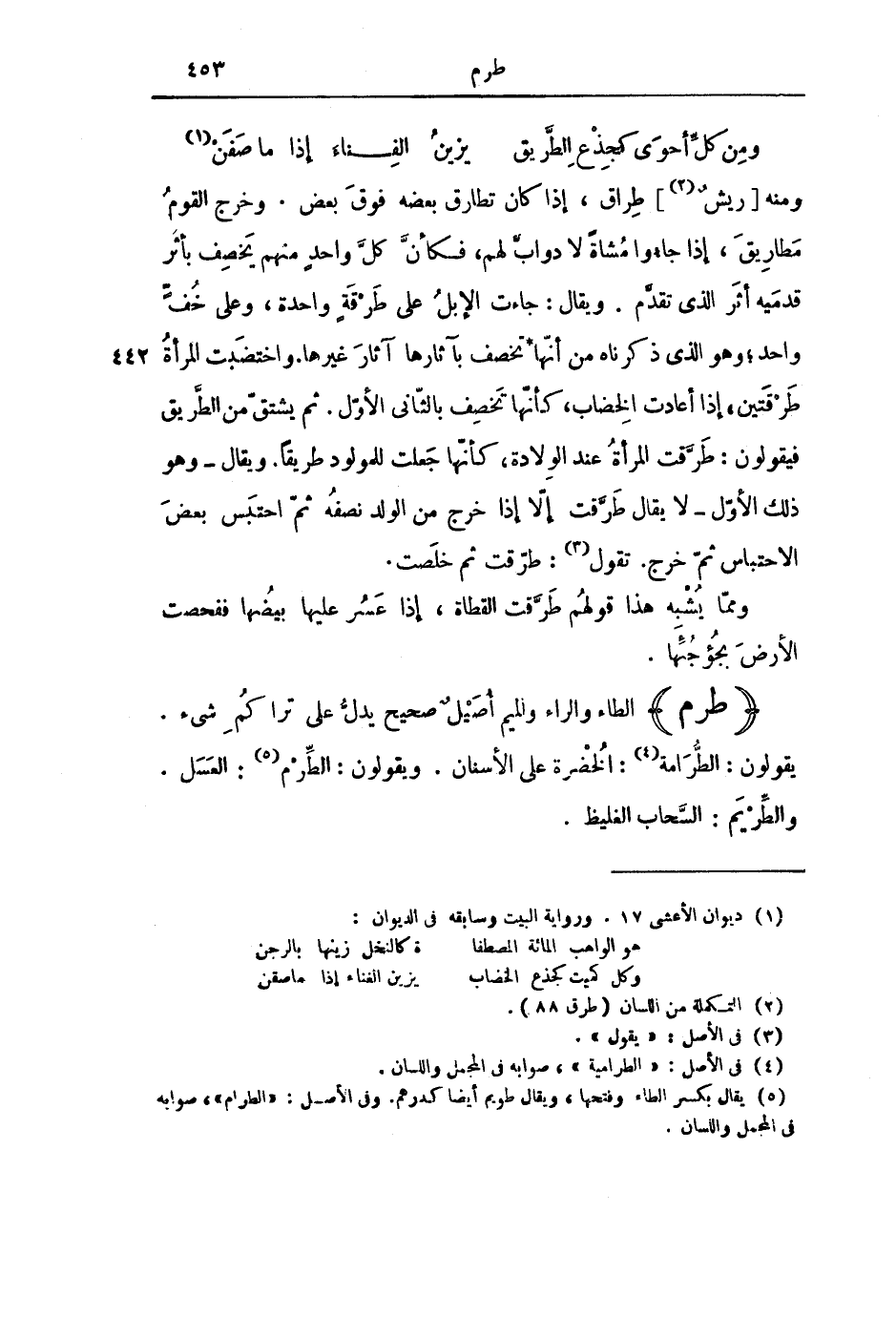 وَمِنْهُ [رِيشٌ] طِرَاقٌ، إِذَا كَانَ تَطَارَقَ بَعْضُهُ فَوْقَ بَعْضٍ، وَخَرَجَ الْقَوْمُ مَطَارِيقَ، إِذَا جَاءُوا مُشَاةً لَا دَوَابَّ لَهُمْ، فَكَأَنَّ كُلَّ وَاحِدٍ مِنْهُمْ يَخْصِفُ بِأَثَرِ قَدَمَيْهِ أَثَرَ الَّذِي تَقَدَّمَ. وَيُقَالُ: جَاءَتِ الْإِبِلُ عَلَى طَرْقَةٍ وَاحِدَةٍ، وَعَلَى خُفٍّ وَاحِدٍ ; وَهُوَ الَّذِي ذَكَرْنَاهُ مِنْ أَنَّهَا تَخْصِفُ بِآثَارِهَا آثَارَ غَيْرِهَا. وَاخْتَضَبَتِ الْمَرْأَةُ طَرْقَتَيْنِ، إِذَا أَعَادَتِ الْخِضَابَ، كَأَنَّهَا تَخْصِفُ بِالثَّانِي الْأَوَّلَ. ثُمَّ يُشْتَقُّ مِنَ الطَّرِيقِ فَيَقُولُونَ: طَرَّقَتِ الْمَرْأَةُ عِنْدَ الْوِلَادَةِ، كَأَنَّهَا جَعَلَتْ لِلْمَوْلُودِ طَرِيقًا. وَيُقَالُ - وَهُوَ ذَلِكَ الْأَوَّلُ -: لَا يُقَالُ طَرَّقَتْ إِلَّا إِذَا خَرَجَ مِنَ الْوَلَدِ نِصْفُهُ ثُمَّ احْتَبَسَ بَعْضَ الِاحْتِبَاسِ ثُمَّ خَرَجَ. تَقُولُ: طَرَّقَتْ ثُمَّ خَلَصَتْ.