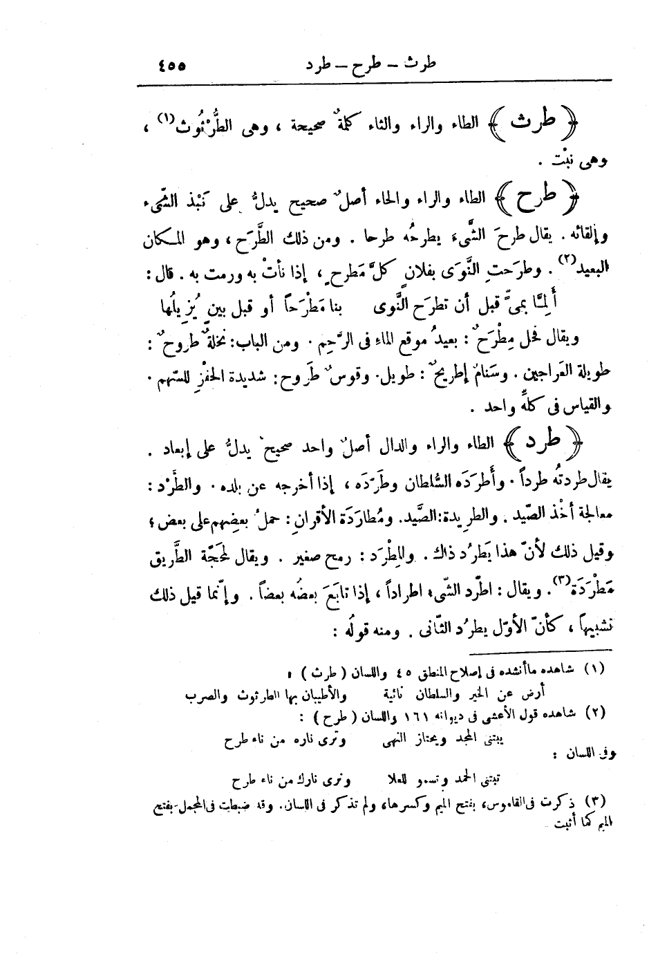 (طَرَدَ) الطَّاءُ وَالرَّاءُ وَالدَّالُ أَصْلٌ وَاحِدٌ صَحِيحٌ يَدُلُّ عَلَى إِبْعَادٍ. يُقَالُ: طَرَدْتُهُ طَرْدًا. وَأَطْرَدَهُ السُّلْطَانُ وَطَرَّدَهُ، إِذَا أَخْرَجَهُ عَنْ بَلَدِهِ. وَالطَّرْدُ: مُعَالَجَةُ أَخْذِ الصَّيْدِ. وَالطَّرِيدَةُ: الصَّيْدُ. وَمُطَارَدَةُ الْأَقْرَانِ: حَمْلُ بَعْضِهِمْ عَلَى بَعْضٍ ; وَقِيلَ ذَلِكَ لِأَنَّ هَذَا يَطْرُدُ ذَاكَ. وَالْمِطْرَدُ: رُمْحٌ صَغِيرٌ. وَيُقَالُ لِمَحَجَّةِ الطَّرِيقِ: مَطْرَدَةٌ. وَيُقَالُ: اطَّرَدَ الشَّيْءُ اطِّرَادًا، إِذَا تَابَعَ بَعْضُهُ بَعْضًا، وَإِنَّمَا قِيلَ ذَلِكَ تَشْبِيهًا، كَأَنَّ الْأَوَّلَ يَطْرُدُ الثَّانِي. وَمِنْهُ قَوْلُهُ: