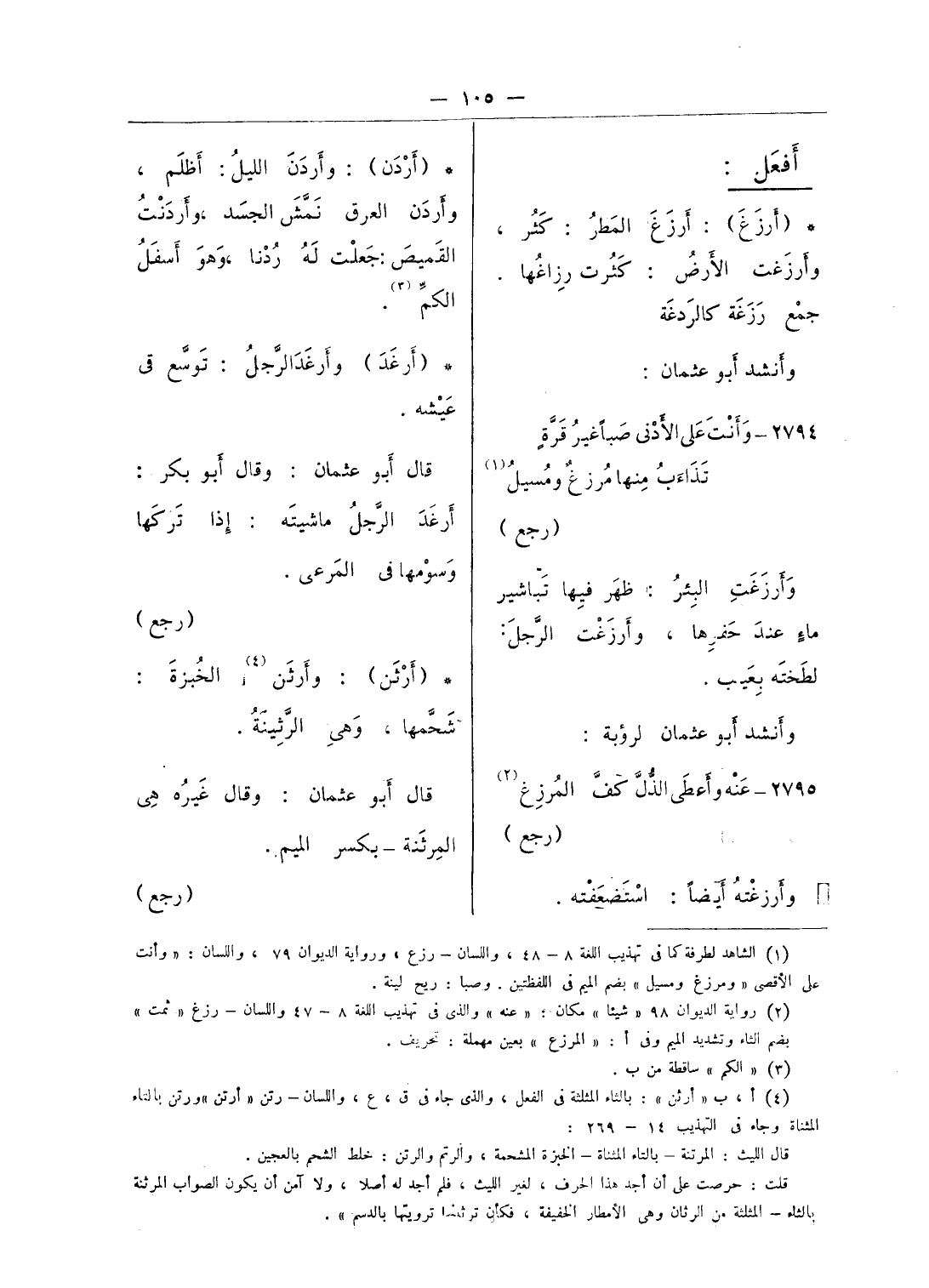 (¬2) رواية الديوان 98 «شيئا» مكان: «عنه» والذى فى تهذيب اللغة 8 - 47 واللسان - رزغ «ثمت» بضم الثاء وتشديد الميم وفى أ: «المرزع» بعين مهملة: تحريف.