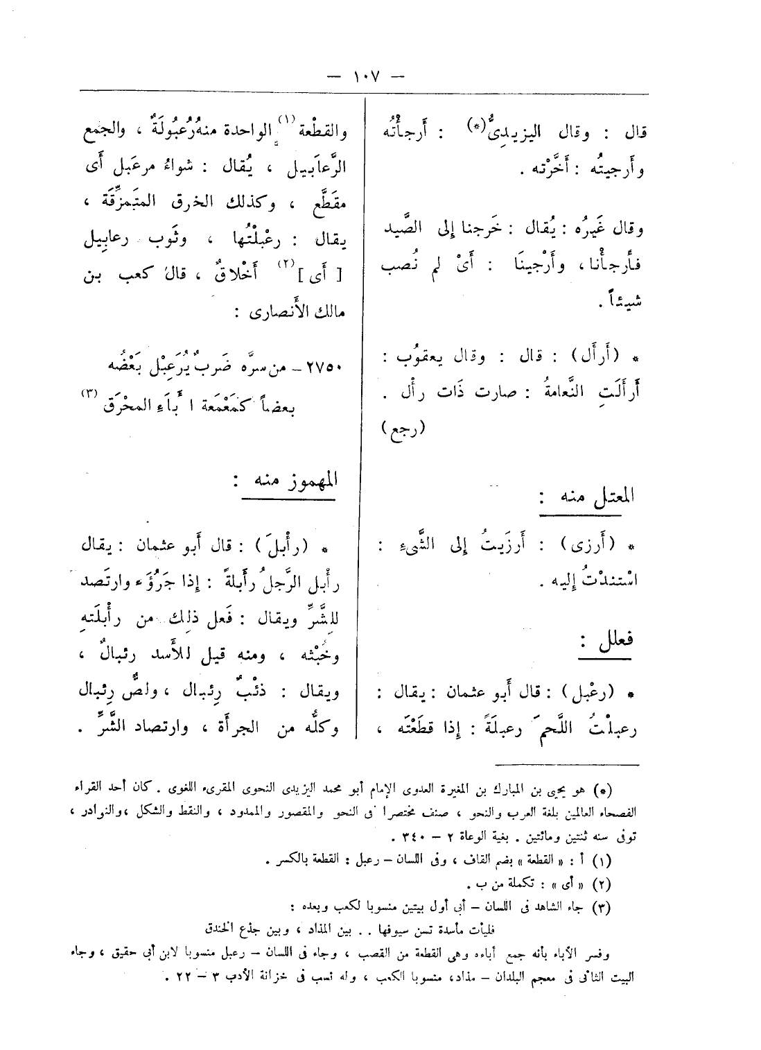 (*) هو يحيى بن المبارك بن المغيرة العدوى الإمام أبو محمد اليزيدى النحوى المقرئ اللغوى. كان أحد القراء الفصحاء العالمين بلغة العرب والنحو، صنف مختصرا فى النحو والمقصور والممدود، والنقط والشكل، والنوادر، توفى سنة ثنتين ومائتين. بغية الوعاة 2 - 340.