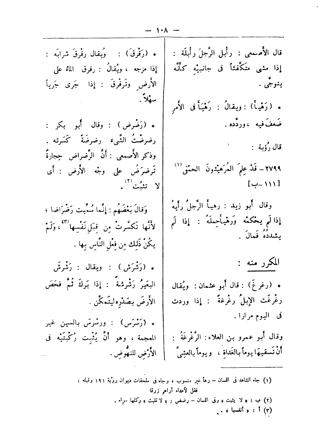 (¬1) جاء الشاهد فى اللسان - رهأ غير منسوب، وجاء فى ملحقات ديوان رؤبة 191 وقبله: