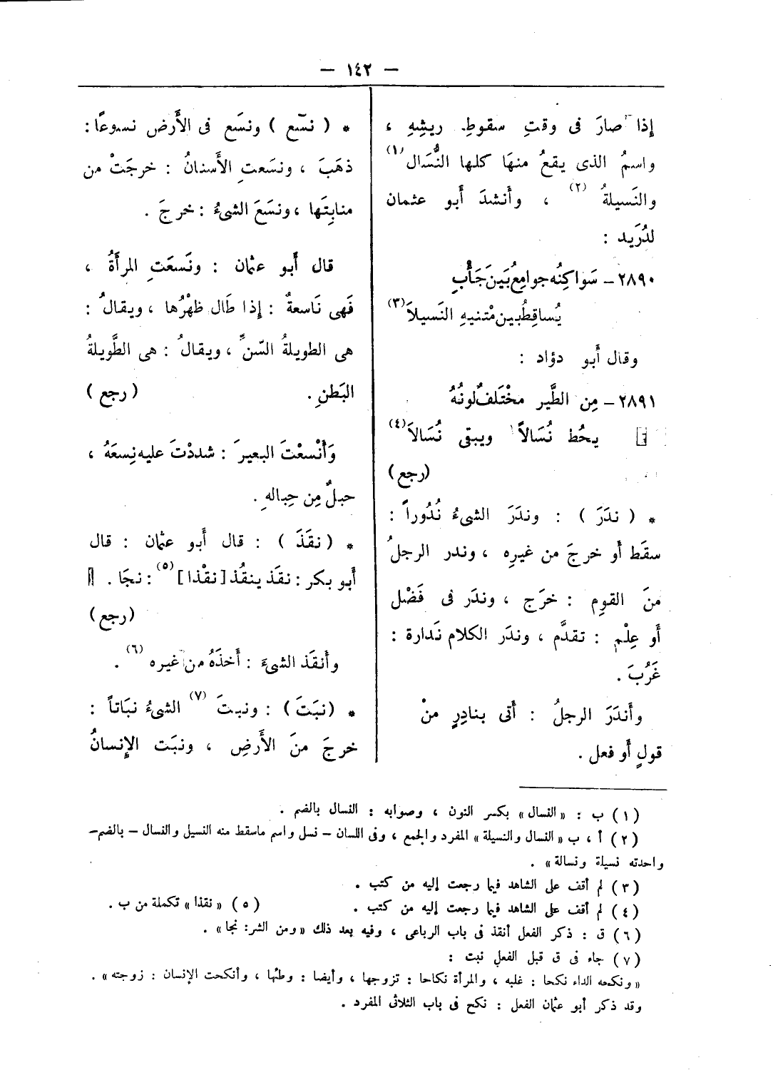 (¬2) أ، ب «النسال والنسيلة» المفرد والجمع، وفى اللسان - نسل واسم ما سقط منه النسيل والنسال - بالضم - واحدته نسيلة ونسالة».